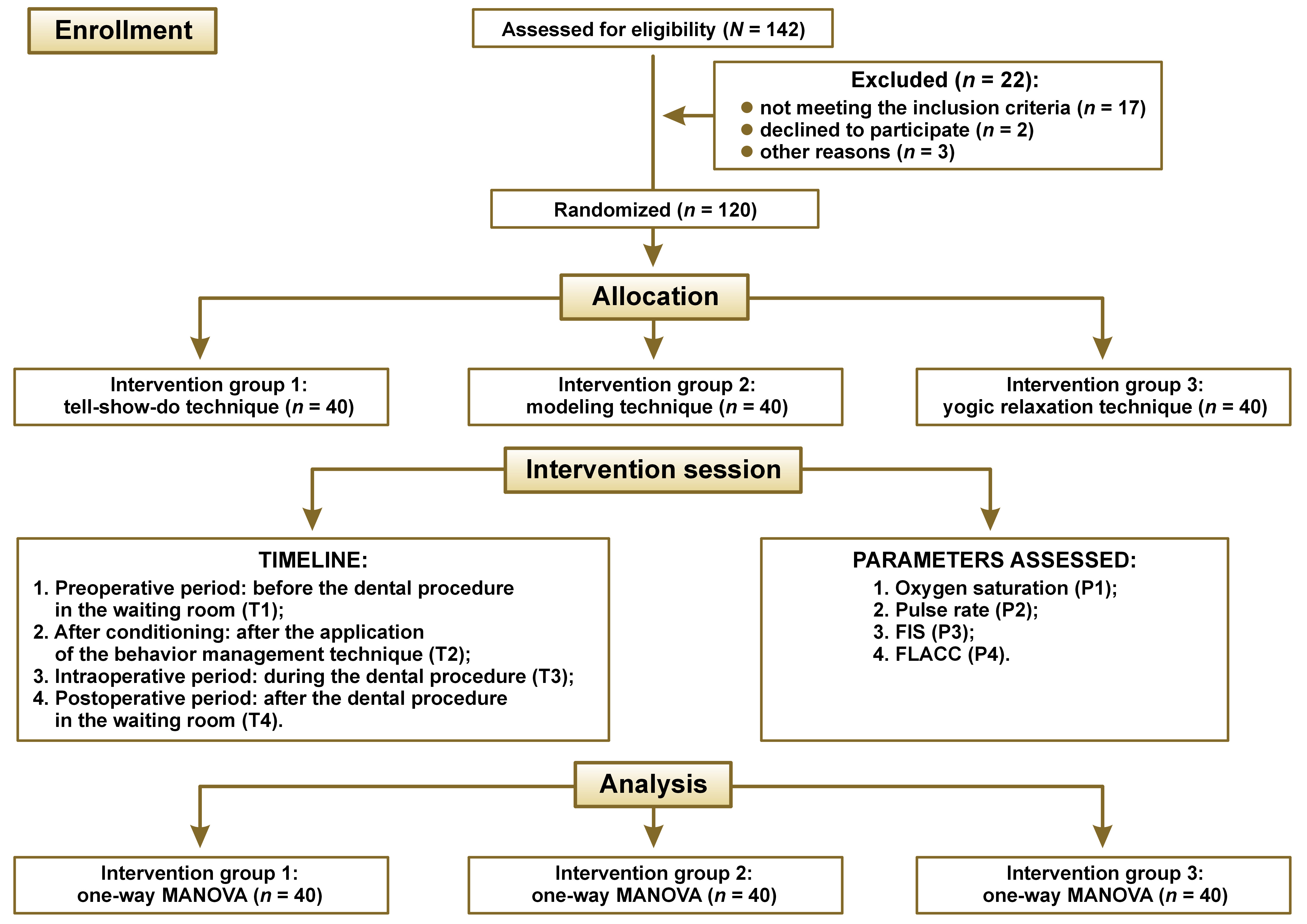 After the comprehensive screening process, 64 boys and 56 girls (N = 120) were selected for inclusion in the study. The children were randomly allocated into 3 equal groups using the lottery method, based on the type of behavior management technique they received: group 1: tell-show-do technique; group 2: modeling technique; group 3: yogic relaxation technique.