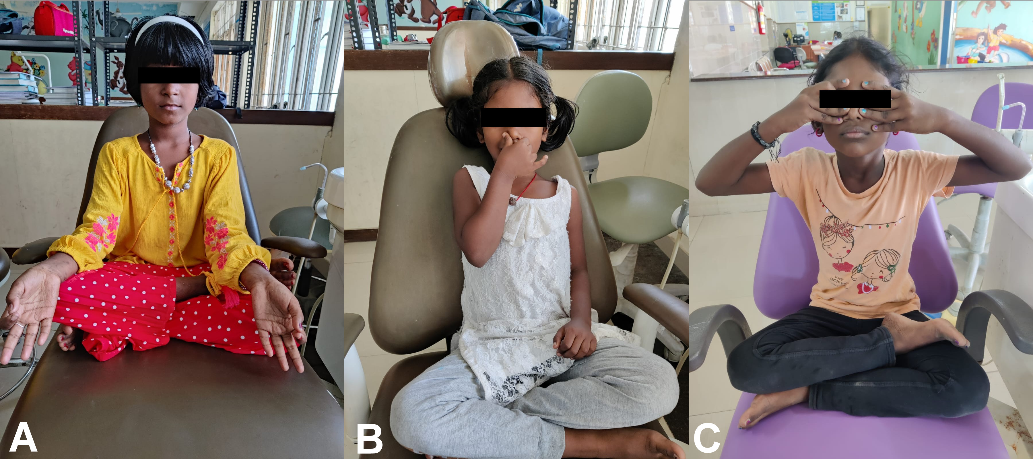 The child was asked to watch a virtually recorded visual demonstration of the yoga poses. Each pose was performed for 5 min under the supervision of the dental professional. Once the yoga session was completed, a 10-min interval was given, after which the dental procedure was initiated.