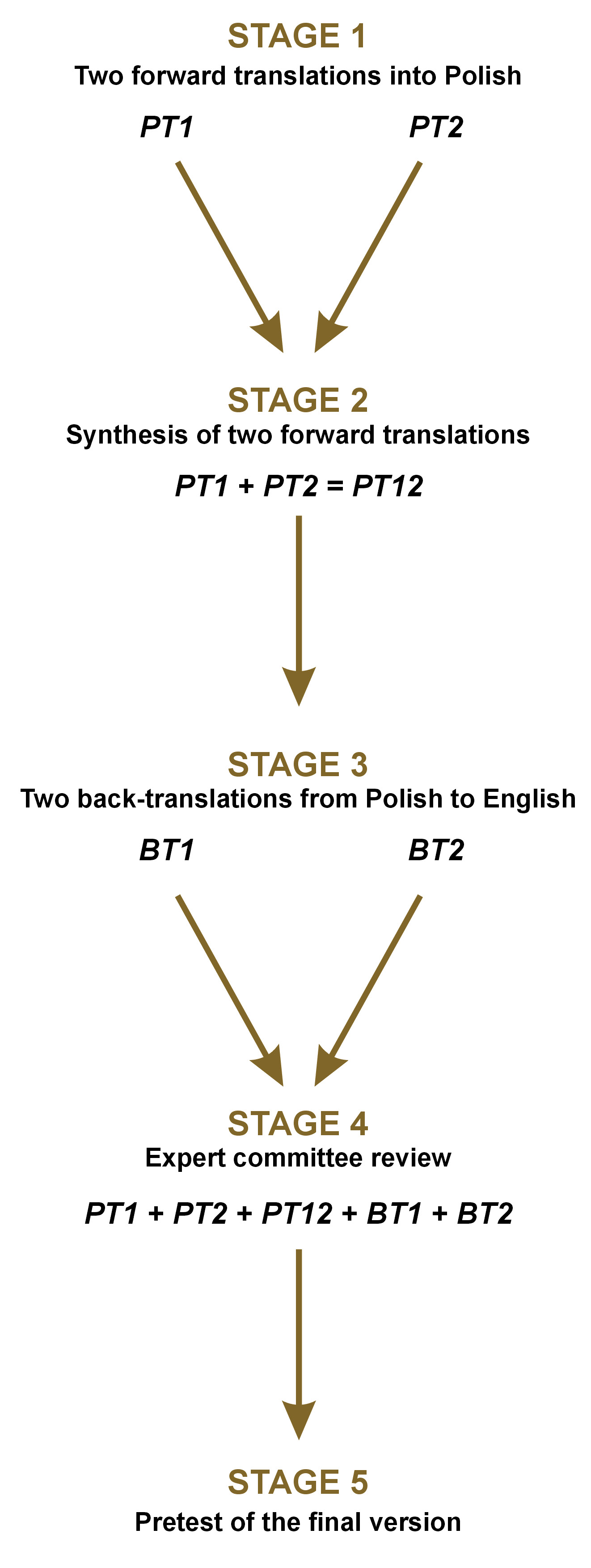 The translation process of the FAI involved 5 stages and adhered to the widely accepted guidelines presented by Beaton et al.13 Initially, the original questionnaire was translated into Polish by 2 independent translators (a TMD specialist (PT1) and an English lecturer (PT2)), both fluent in English and native Polish speakers. Subsequently, a consensus was reached to create an agreed version (PT12). Next, a back-translation from Polish to English was conducted by 2 individuals (BT1, BT2), who were native English speakers and unaware of the original English version of the questionnaire.