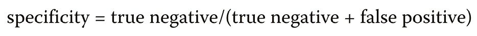 Specificity, which represents the ability to identify true negatives (i.e., the proportion of TMD-free individuals correctly identified by the FAI-PL out of the total number of non-TMD controls established by the RDC/TMD), was calculated using the following formula (Equation 2):