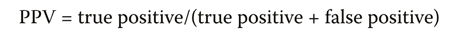 Additionally, positive and negative predictive values were calculated. The positive predictive value (PPV) indicates the percentage of individuals with a positive test outcome who have TMD. It can be calculated using the following formula (Equation 3):