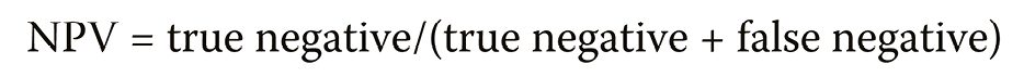 The negative predictive value (NPV) is the probability that subjects with a negative screening test truly do not have TMD. It is calculated as follows (Equation 4):