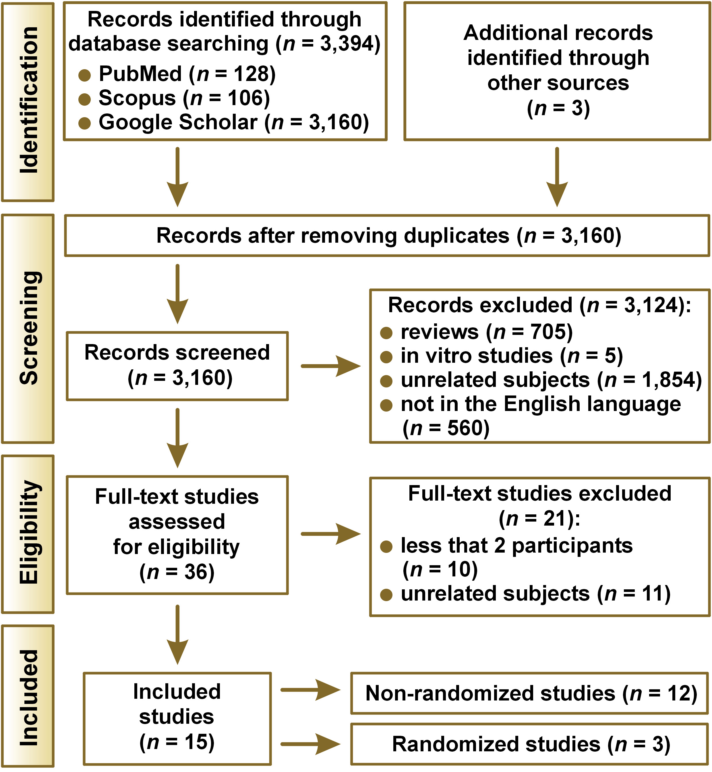 Figure 1 displays the diagram of study selection. The initial search yielded 3,397 publications, from which 3,124 irrelevant articles were excluded based on their titles and abstracts. The remaining 36 studies were assessed for eligibility based on the inclusion criteria and the full text of each article was retrieved for further evaluation. After a detailed review, 12 records were retained for data extraction. Three additional records were identified by reading the reference lists in each included study. The selected studies were published between 1987 and 2019. The studies came from Italy (n = 5),15, 27, 28, 29, 30 Brazil (n = 3),31, 32, 33 Norway (n = 2),34, 35 Spain (n = 1),36 Denmark (n = 1),37 Switzerland (n = 1),38 Scotland (n = 1),39 and the United Kingdom (n = 1).16