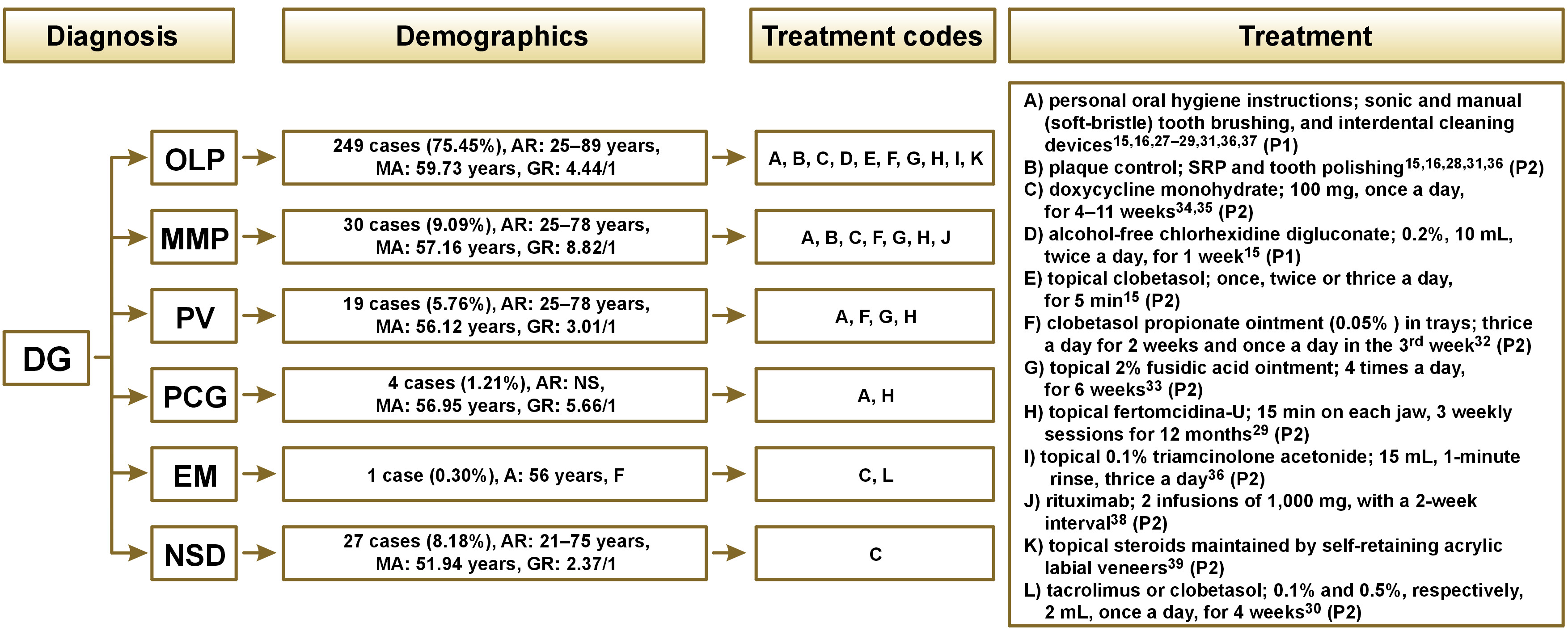 It could be inferred that OLP and MMP are the mucocutaneous diseases responsible for most DG cases reported. It is also conceivable that the majority of DG patients, observed and/or treated, are women in their 6th (or higher) decade of life. Some clinicians believe that any DG patient must undergo an initial phase (P1) of personal oral hygiene instructions (e.g., sonic and manual tooth brushing, interdental cleaning devices, and mouthwash) and professional plaque control (e.g., SRP and tooth polishing). If the results of the 1st phase are underwhelming, they enter the 2nd phase of treatment (P2), with different therapeutics. This assumption could be reliable to some degree; most OLP and MMP cases analyzed in this review used personal oral hygiene instructions (A) and professional plaque control (B), followed by desirable results. However, some DG patients (regardless of their diagnoses) have symptoms regardless of their excellent personal oral hygiene routines and regular periodontal visits. These patients are not proper candidates for the initial phase of DG treatment, and should be introduced to/prescribed with different therapeutics. Antibiotics (e.g., doxycycline monohydrate and fusidic acid), antiseptics (e.g., fertomcidina-U), immunosuppressive agents (e.g., tacrolimus), corticosteroids (e.g., clobetasol), and glucocorticoids (e.g., triamcinolone) can all be used for diminishing DG signs and symptoms. Doxycycline monohydrate and topical clobetasol can both be used for DG patients with OLP and MMP. The published data concerning the treatment of DG is not cohesive and convincing enough to turn into a comprehensive guideline. However, relying on the data extracted from the 15 included studies, a step-by-step protocol was proposed to guide clinicians faced with DG patients.