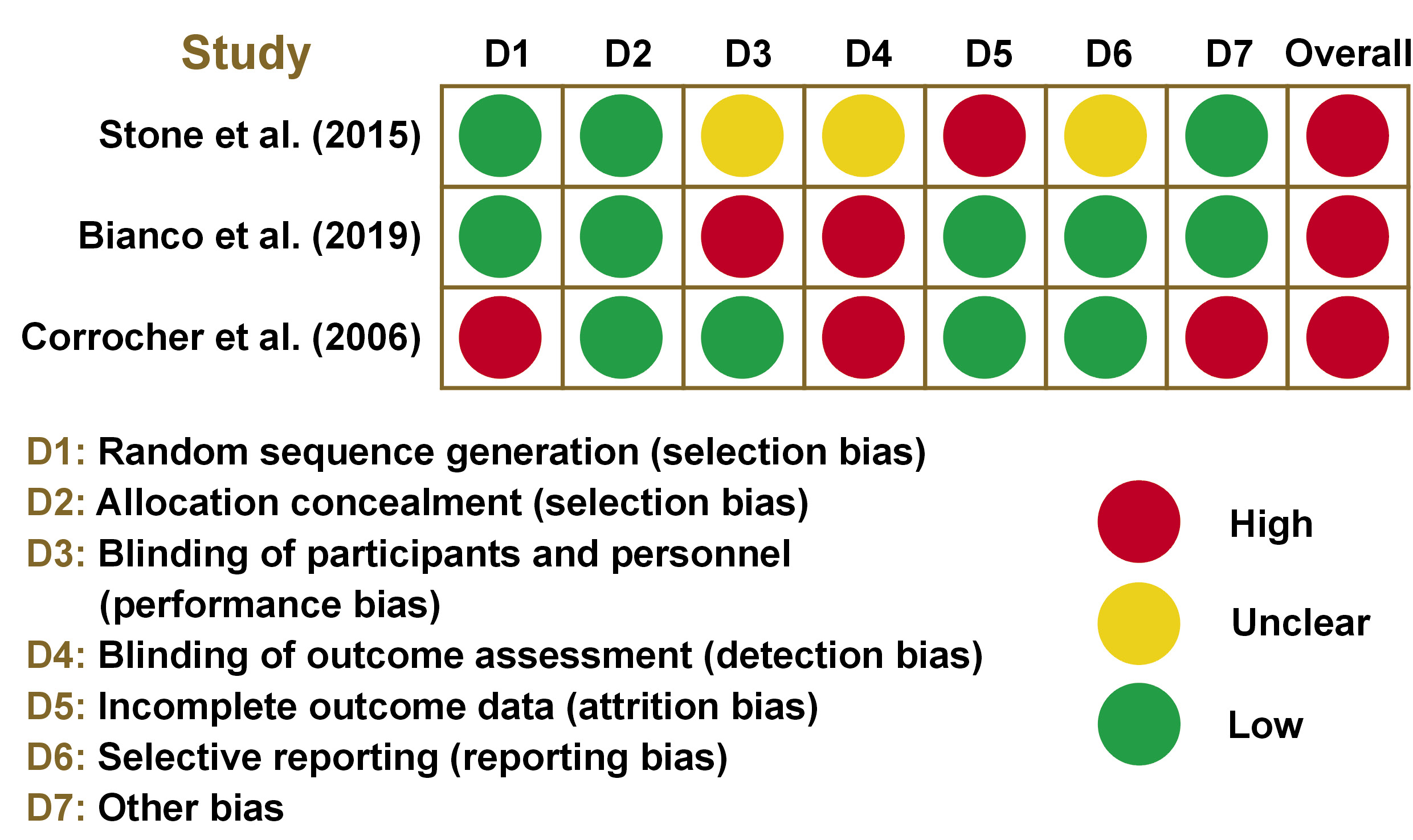According to our risk of bias assessment (Figure 3 and Figure 4), our included studies had a moderate-to-high risk of bias on average.
