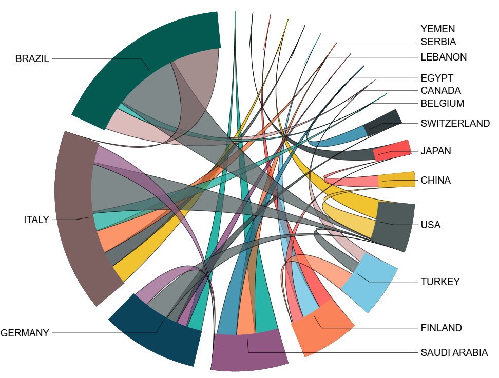 Figure 4 shows the countries engaged in collaborative research related to glass fiber. Brazil, Italy and Germany demonstrated the greatest degree of collaboration in various studies related to dental fiber and other related areas. These 3 countries demonstrated a significant level of collaboration with the USA. With regard to the Arab region, Saudi Arabia had demonstrated the highest degree of collaboration (Figure 4). Among the countries of Finland, Turkey, the USA, China, and Japan, Finland and Turkey showed high inter-collaborative publication activity.