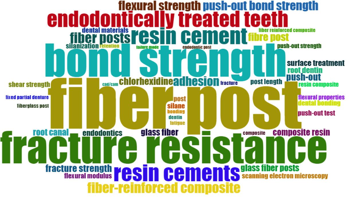 The word cloud shown in Figure 5 provides the most frequently used keywords in glass fiber research in dentistry. The terms “fiber post”, “fracture resistance”, “bond strength”, and “endodontically treated teeth” were the most prevalent in the studies relevant to dental fiber. Other notable terms include “resin cement”, “adhesion” and “fiber-reinforced composite.”