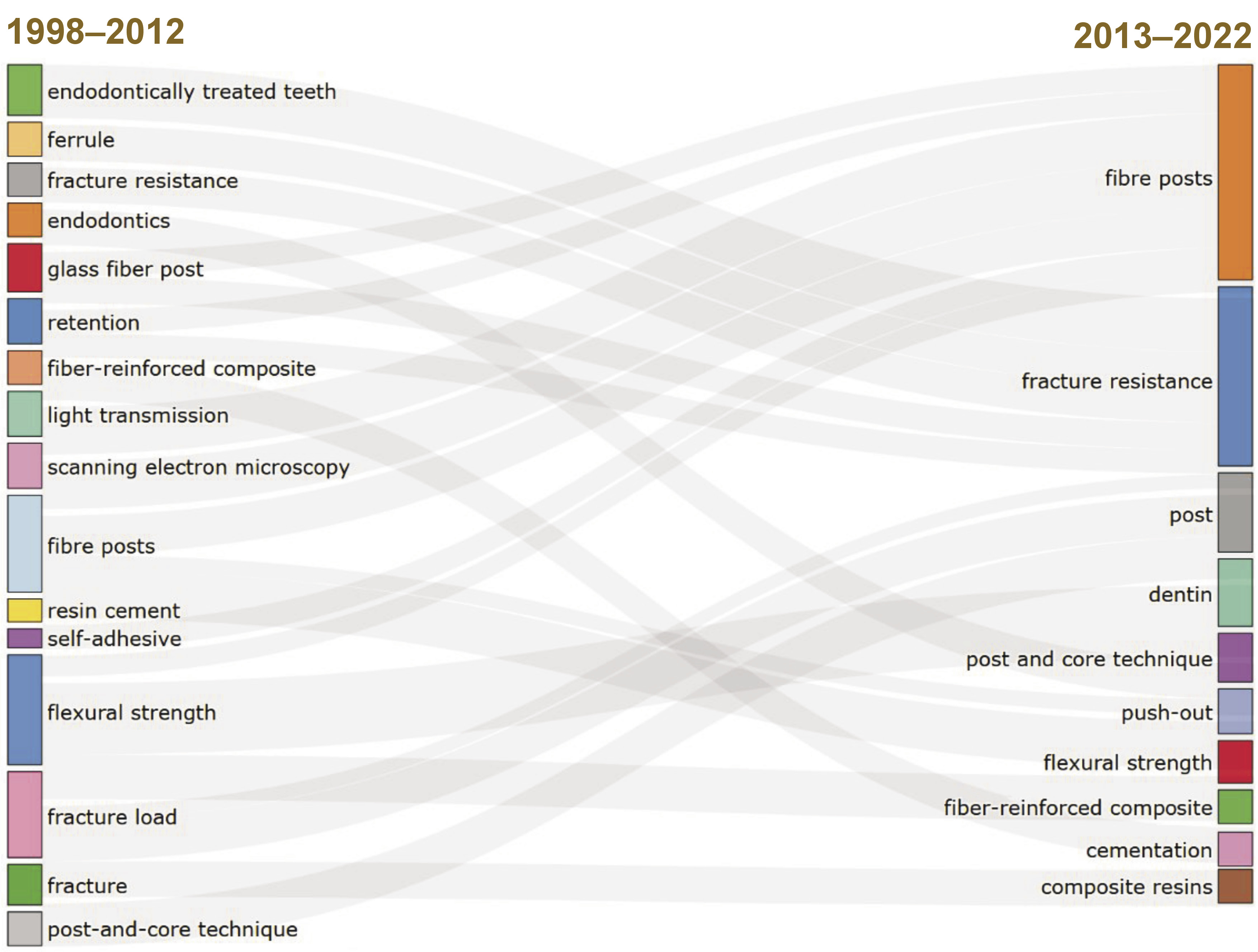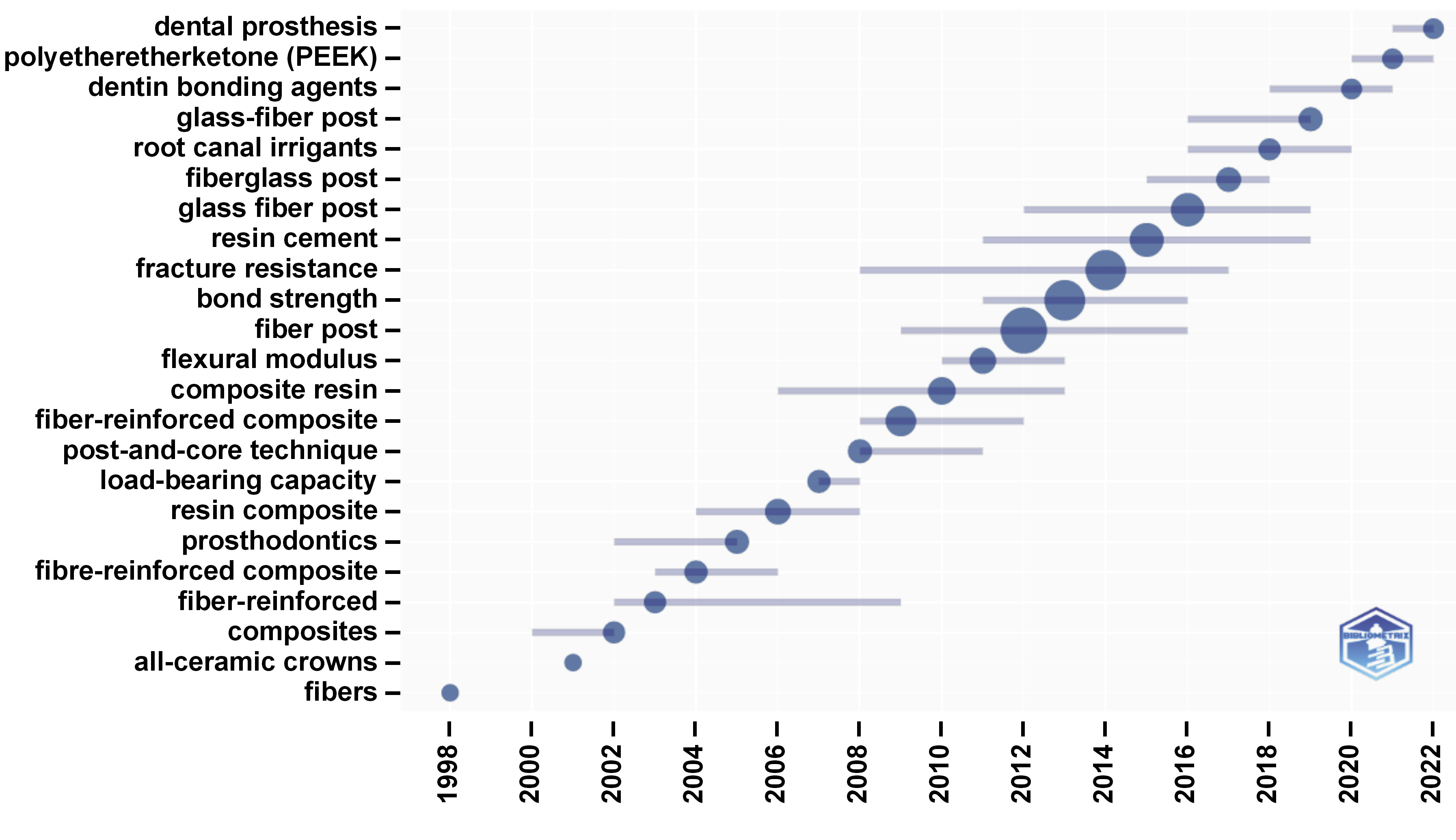 Figure 9 shows the evolution of trending topics between 1998 and 2022. In the early years of the study period, the term “fibers” was mostly used. Conversely, in recent years, the terms “dental prosthesis”, “polyetheretherketone (PEEK)”, “dentin bonding agents”, and “glass-fiber post” were the most common. The terms “fiber post”, “bond strength” and “fracture resistance” were among the most frequently used between the years 2012 and 2016.