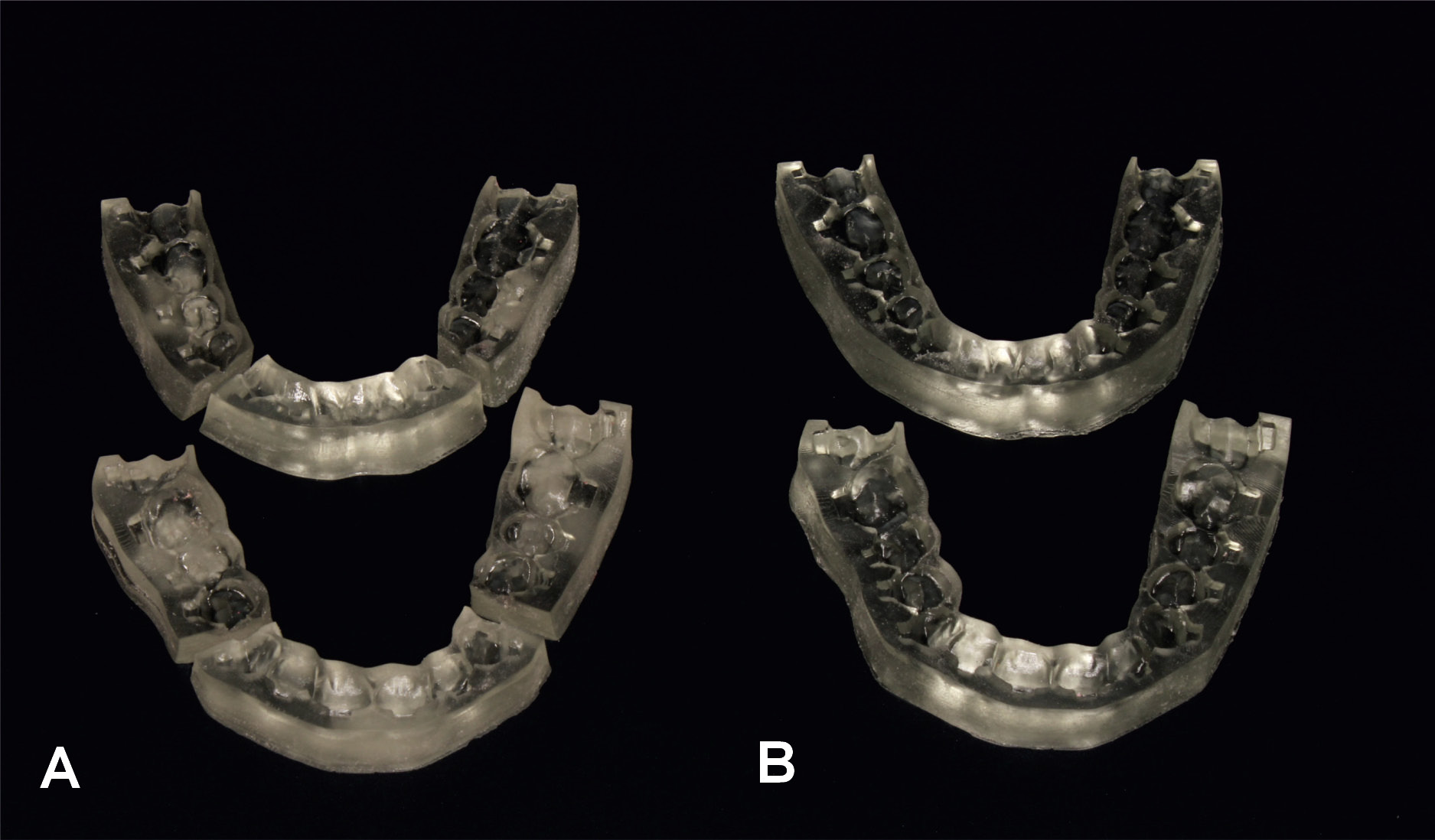 Currently, 6 technologies are used in 3D printing: stereolithography (SLA); digital light processing (DLP); fused filament fabrication (FFF); selective laser sintering (SLS); liquid crystal display (LCD); and PolyJet. Hazeveld et al. suggested the use of DLP or PolyJet prints, as they proved to be more precise than SLA.22 However, due to the rapid evolution of 3D printing and the differences in printer designs, there is no scientific evidence to suggest that 1 method is superior in terms of providing the most accurate models. At the time of designing our study, the SprintRay Pro 95 3D printer was one of the most advanced DLP printers. To minimize bias associated with the printing process, both the models and the IDB transfer trays were printed with the highest possible accuracy of the material used, which was 50 µm.