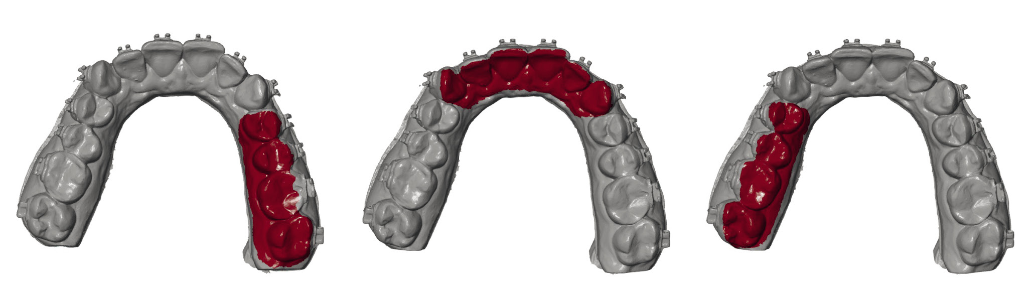 A randomly selected patient’s occlusion was scanned using a TRIOS® 3 Intraoral Scanner (3Shape A/S, Copenhagen, Denmark) with an accuracy of 6.9 µm, resulting in the initial dental scan (IDS). The patient presented with Angle Class I malocclusion on the right side and Angle Class II malocclusion on the left side, in addition to dental crowding, a normal overbite and an increased overjet. Subsequently, virtual pre-torqued brackets (Victory Series™ LP Roth 022 APC Flash-Free; 3M ESPE, St. Paul, USA) were placed on the virtual teeth of the IDS using Ortho Analyzer 2019 software (3Shape A/S), resulting in the master scan (MS). Based on the MS, transfer trays for the IDB were designed to rest solely on the teeth, thus avoiding contact with the gingiva and fully covering the brackets, with the exception of the undercuts of the gingival bracket wings. The thickness of each IDB transfer tray reached 2.3 mm around the brackets and at least 4 mm in the occlusal part.