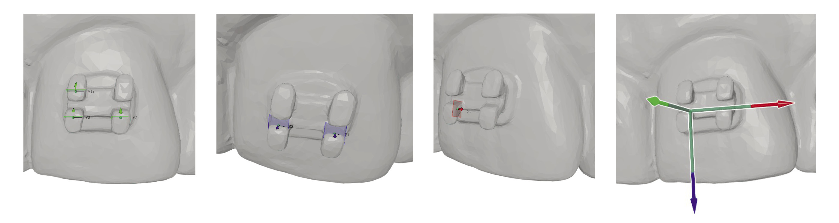 Using GOM Inspect V8 SR1 software (Carl Zeiss GOM Metrology GmbH, Braunschweig, Germany), the ASs with brackets bonded using 3D-printed IDB transfer trays were superimposed on the MSs of the patient’s dentition with brackets generated by the Ortho Analyzer software. Only the lingual and occlusal surfaces of the dentition were selected to ensure that the superimposition did not include the brackets. To prevent bias in the imposition, the dental arches were divided into 3 sections: from the right second molar to the right first premolar; from the right canine to the left canine; and from the left first premolar to the left second molar. The superimposition was conducted for each section separately in order to enable the identification of the optimal fit at the local level (Figure 2). To determine the differences between the bracket positions in the MSs and the ASs, the “3-2-1” technique was applied using the local X, Y and Z coordinate system, with the reference points illustrated in Figure 3. The 2 coordinate systems were compared using GOM Inspect software to calculate the differences between bracket positions in the MSs and the ASs and provide the linear or angular errors. The linear errors in the mesio-distal, linguo-vestibular and occluso-gingival directions were measured as the distances between the bracket positions in the MS and the AS in relation to the X-, Y- and Z-axes, respectively. Any toric, oblique, or rotational errors were measured as the inclination of the bracket positions from the MS to the AS in relation to the X-, Y- and Z-axes and noted as torque, tip and rotation, respectively. For linear measurements, a positive value indicated mesial, vestibular, or occlusal bracket displacement. For angular measurements, a positive value indicated palatal/lingual crown torque, mesial tipping, or disto-vestibular rotation of the bracket. To assess the repeatability of the “3-2-1” technique, measurements of the same model were repeated 3 times by the same experienced operator, 7 days apart.