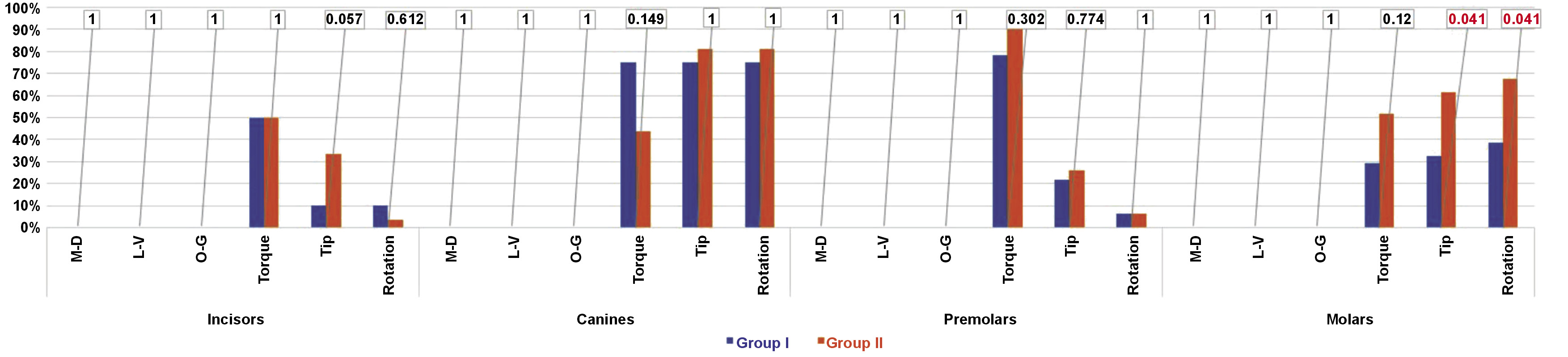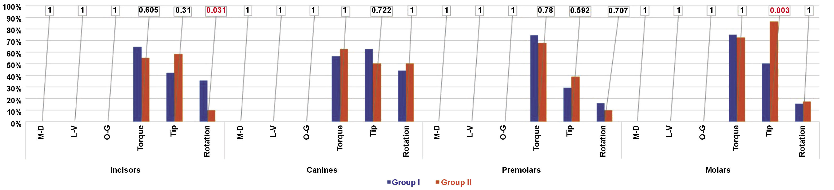 In Group I, all brackets on the incisors, canines and premolars were displaced mesially. The incisor and molar brackets in both groups, as well as the premolar brackets in Group II, exhibited vestibular displacement. The premolar brackets in Group I, as well as the molar brackets in both groups, were displaced gingivally, whereas the canine brackets from Group II were shifted toward the occlusal plane. The incisor, premolar and molar brackets in both groups, as well as the canine brackets in Group II, exhibited lingual crown torque. Mesial tipping of the incisor brackets in both groups and the premolar brackets in Group II was also observed. However, mesial rotation of the canine brackets occurred only in Group II (Table 2).