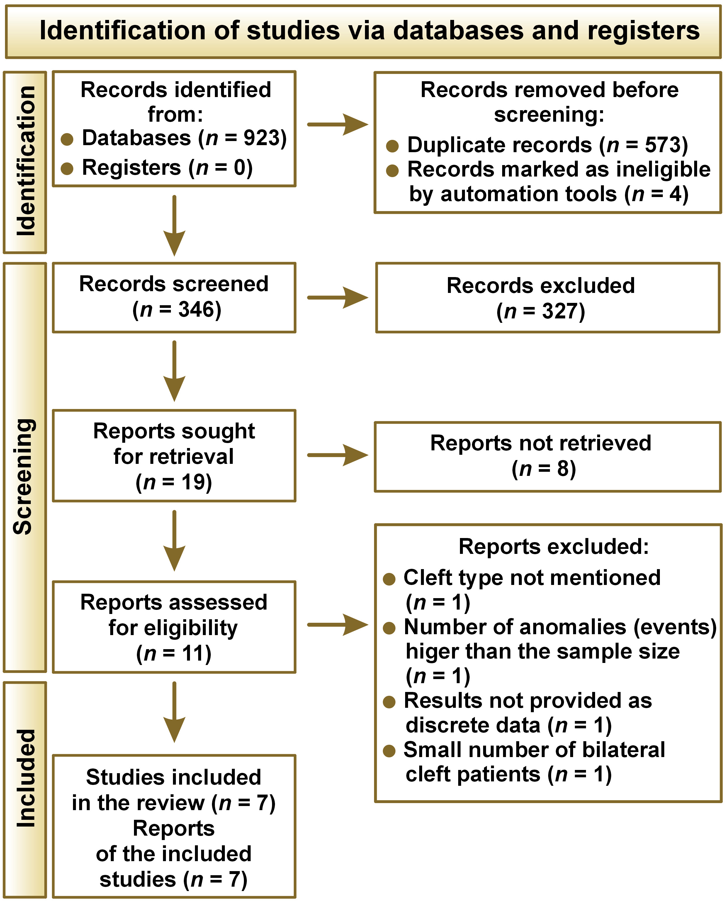 The search database yielded a total of 923 articles (Figure 1). Duplicate studies and studies marked as ineligible by automation tools were removed and abstracts of the remaining 346 articles were screened. Of these, the full texts of 11 articles underwent screening. Seven articles fulfilled the inclusion criteria and were included in the present analysis. Four studies were excluded from the analysis due to the following reasons: the cleft type was not mentioned in the data; the number of anomalies (events) was higher than the sample size27; the results were not given as discrete data28; and there was a small number of bilateral cleft patients, which may have introduced bias.17