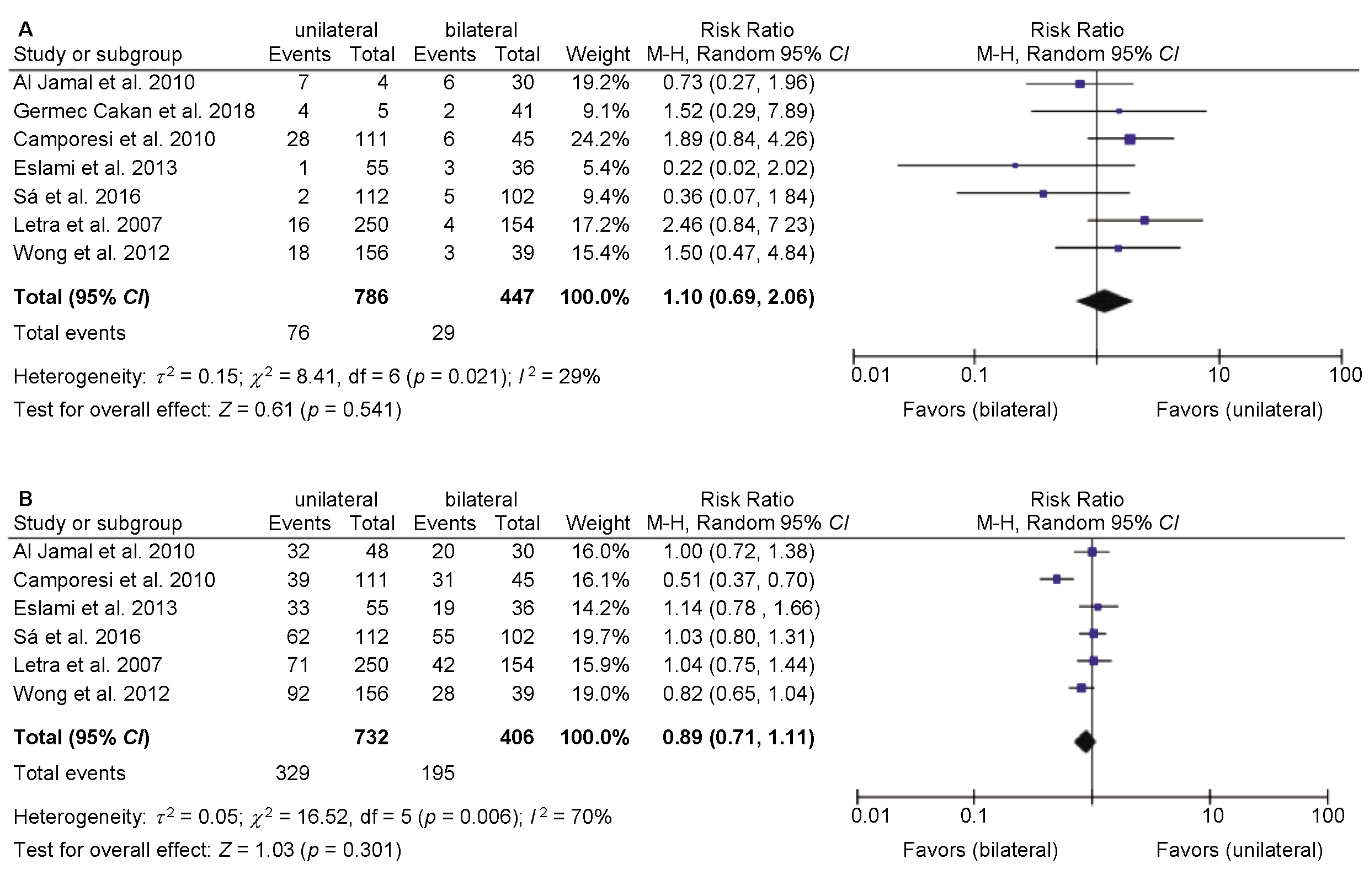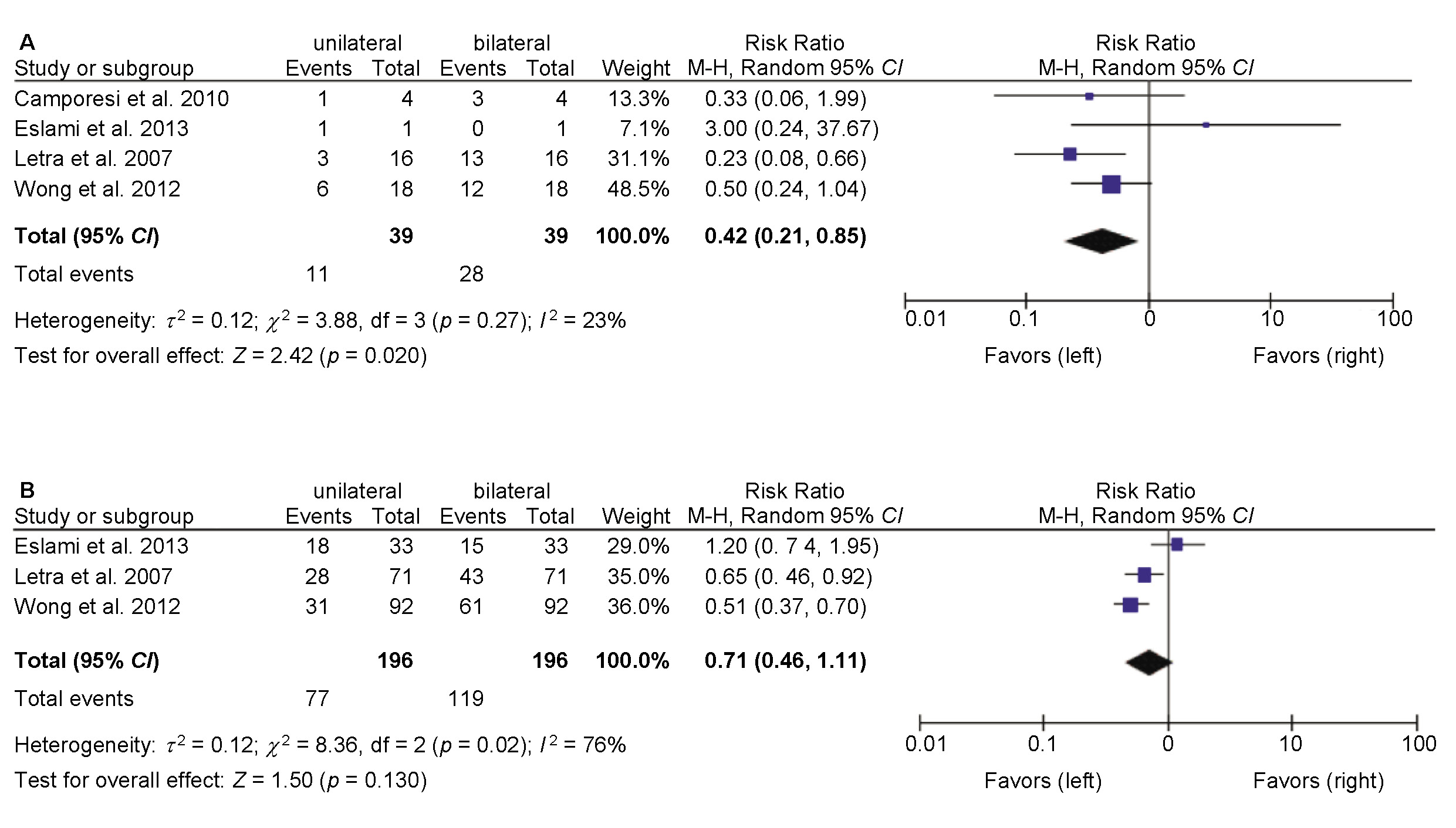 The forest plot illustration of the random-effects meta-analysis of the included studies for ST and A/MT in patients with left and right unilateral CLP is presented in Figure 3. In the current analysis, the standard mean difference obtained for ST in patients with left and right unilateral CLP was 0.42 (95% CI: 0.21–0.85), and for A/MT in patients with left and right unilateral CLP, it was 0.71 (95% CI: 0.46–1.11). The variation was statistically significant for the prevalence of ST in patients with left or right unilateral CLP, with a p-value of 0.020, favoring left unilateral CLP. Low statistical heterogeneity was reported among the included studies, with I2 = 23% (p > 0.05). On the other hand, the difference was statistically insignificant for the prevalence of A/MT in patients with left and right unilateral CLP, with a p-value of 0.130 and high statistical heterogeneity among the included studies (I2 = 76%, p < 0.05).