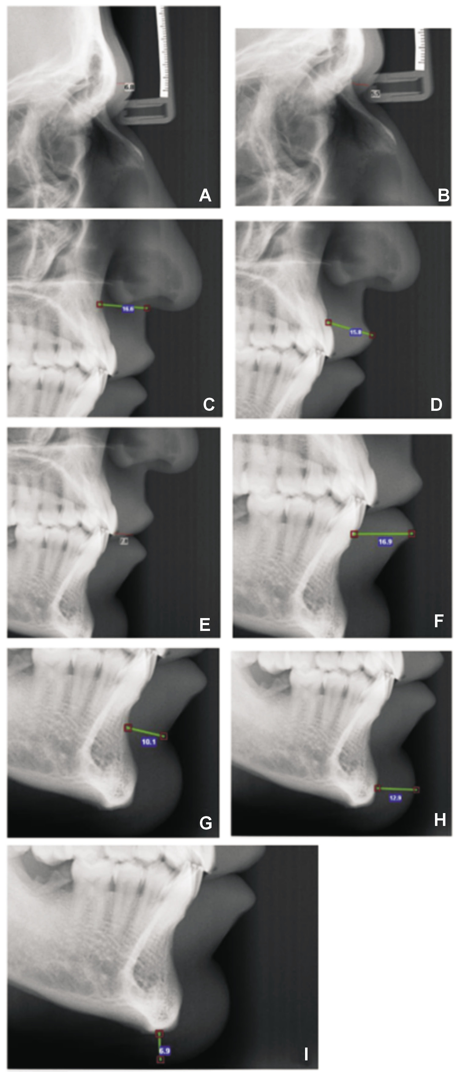 – Pog–Pog’: distance between the pogonion (Pog) or most prominent point of the chin and its soft tissue analog point (Figure 1H);