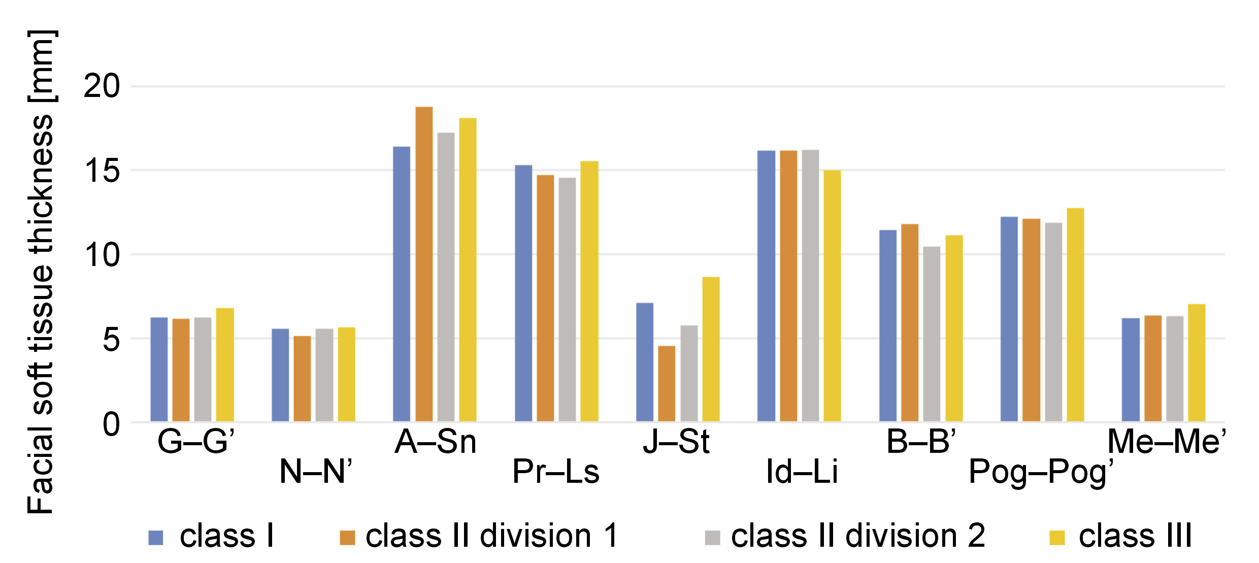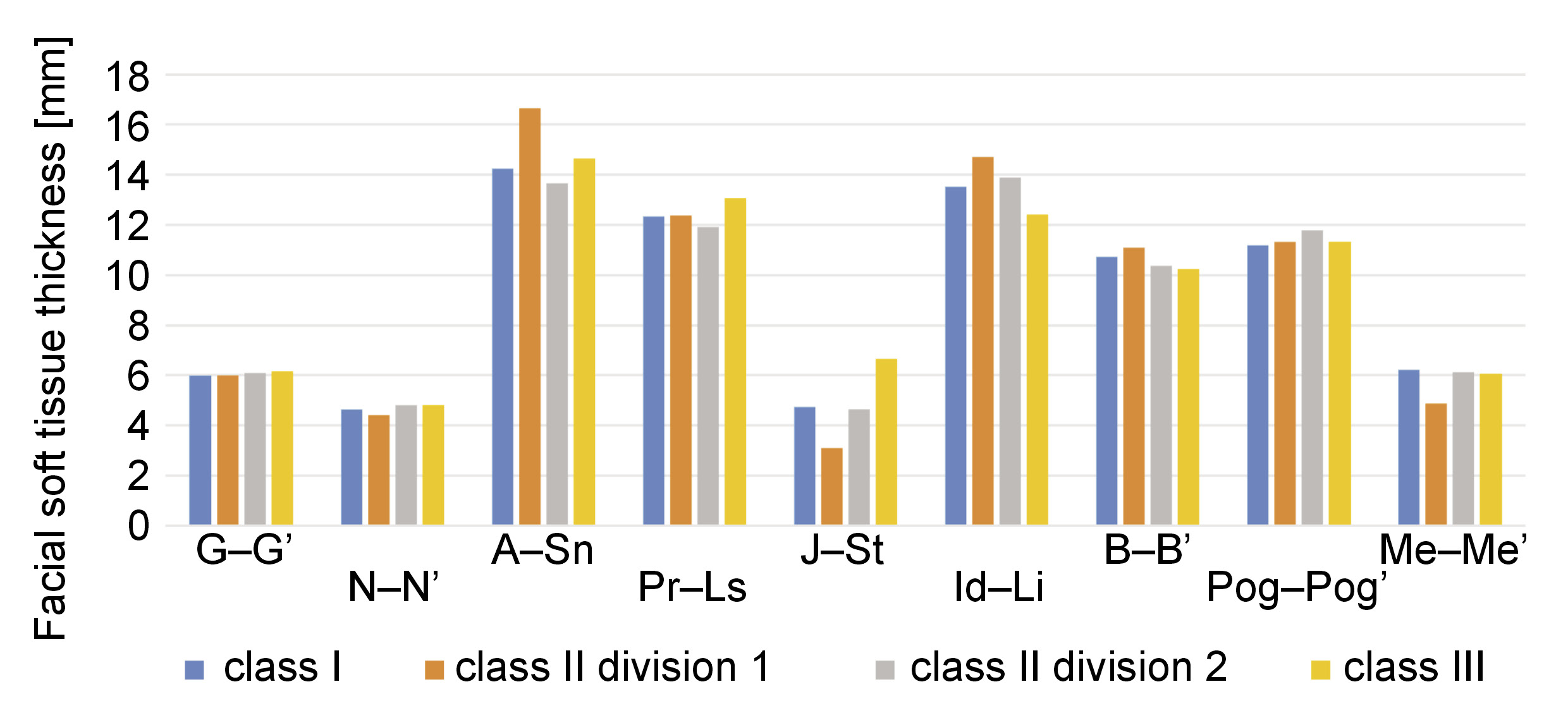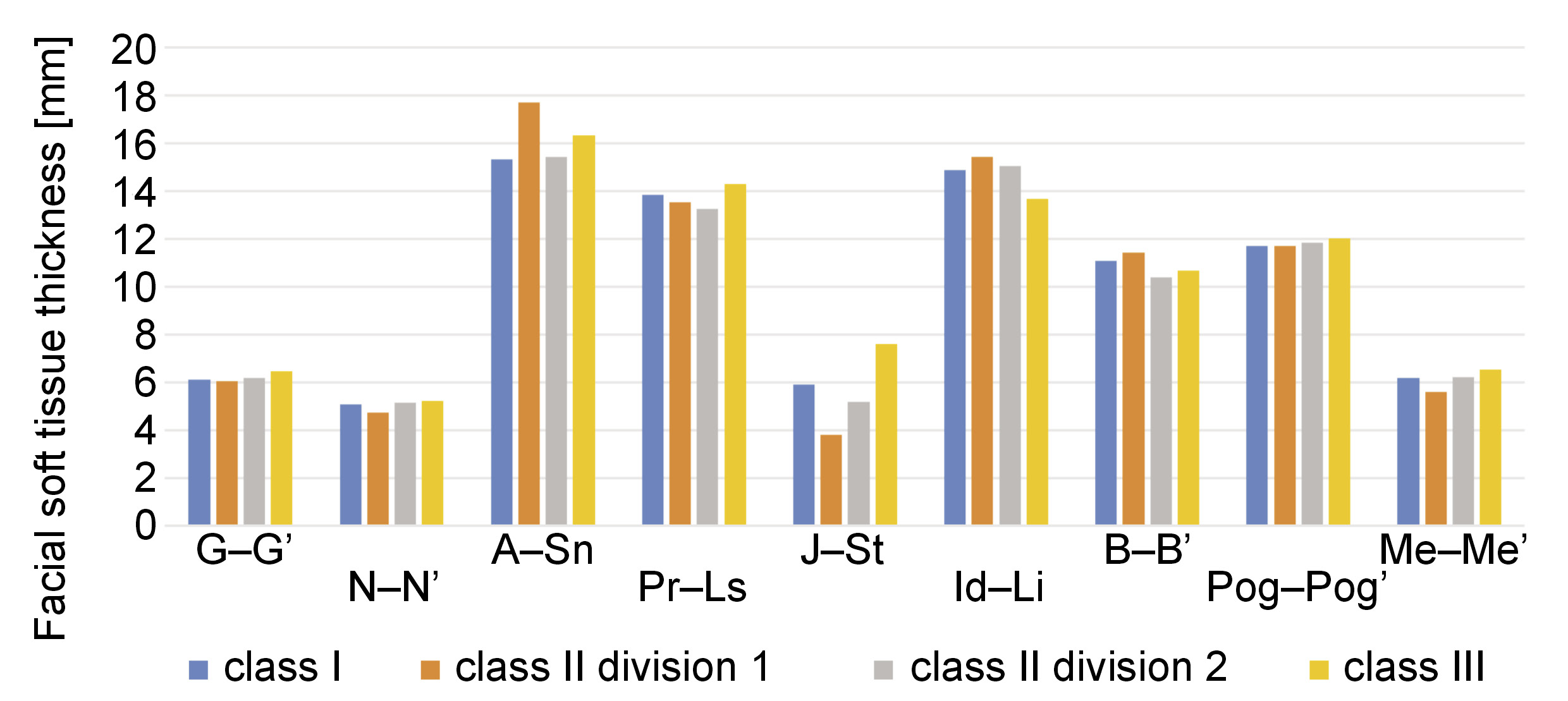 Linear measurements of the soft tissue thickness were made at 9 facial midline landmarks. Angular measurements were obtained by calculating the ANB angle and the inclination angle of upper central incisors. The mean thickness of the facial soft tissue was evaluated for each group.