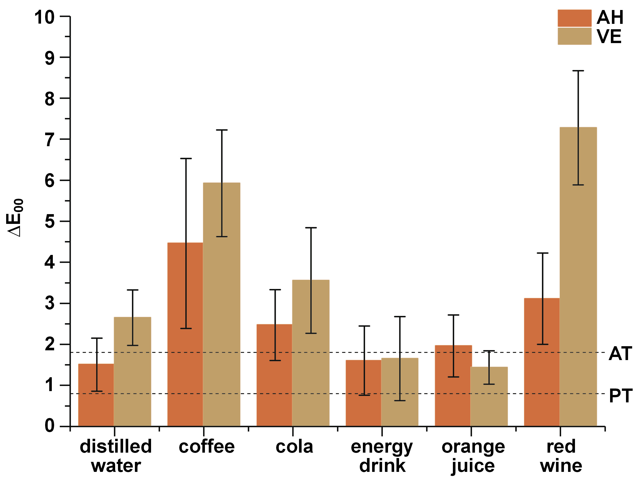 The baseline values for the color coordinates of AH and VE were, respectively, 62.58 and 61.58 for L*, −0.158 and −0.213 for a*, and 6.748 and 9.651 for b*. Table 3 and Figure 1 show the mean values of ∆E00, ∆L*, ∆a*, and ∆b* after immersion in various beverages, with differences between the 2 materials within the same beverage group and between the beverage groups within the same material.