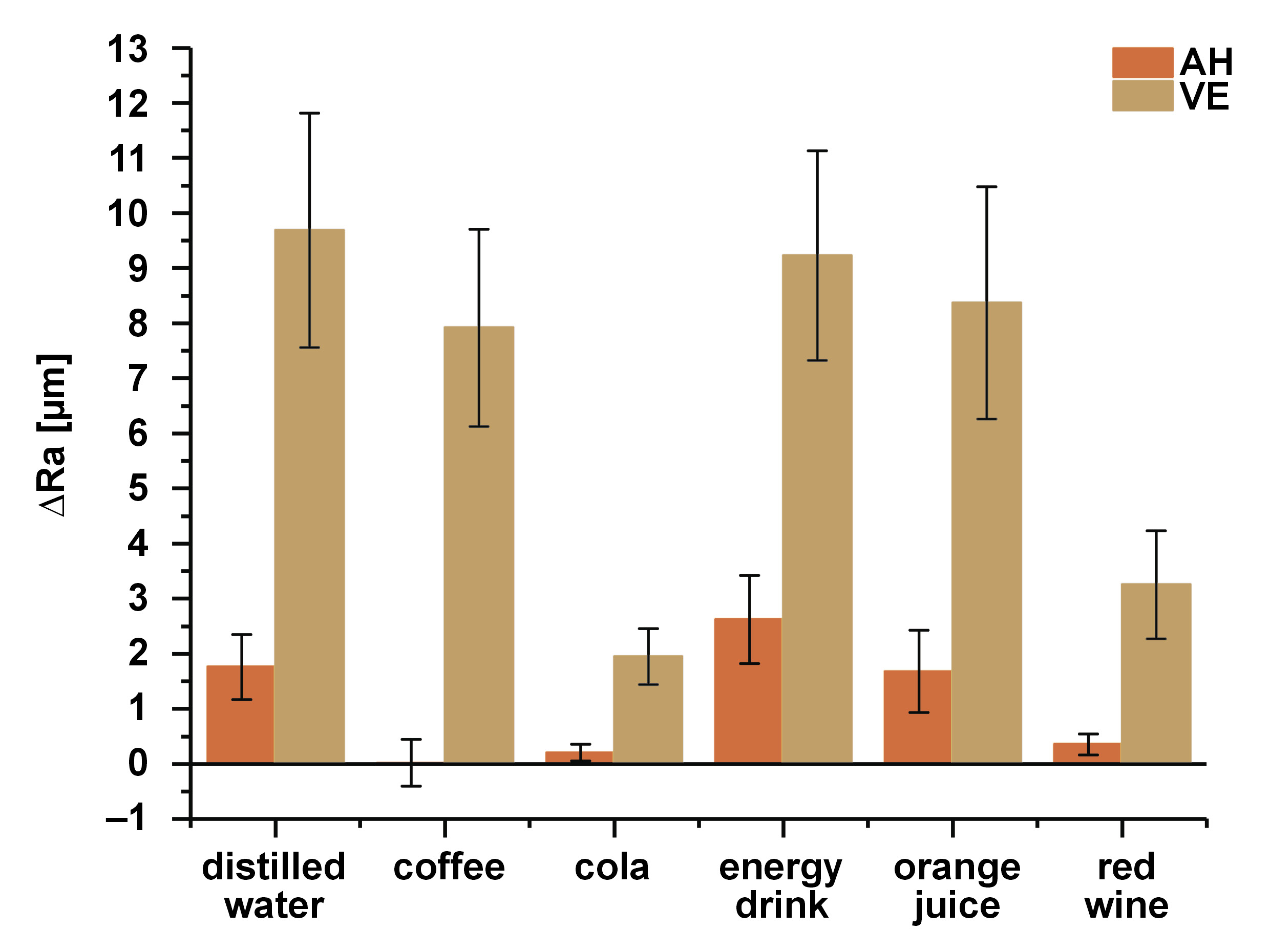The ΔRa results show that AH differed from VE (p < 0.05), except when exposed to cola (p = 0.168) (Figure 2). The type of beverage to which AH was exposed did not seem to influence the ΔRa results, while in the VE group, some differences could be detected between the beverages (immersion in cola and red wine presented a smaller roughness change as compared to other beverages tested): distilled water vs. cola (p < 0.001); distilled water vs. red wine (p < 0.001); coffee vs. cola (p < 0.001); coffee vs. red wine (p = 0.005); the energy drink vs. cola (p < 0.001); the energy drink vs. red wine (p < 0.001), orange juice vs. cola (p < 0.001); and orange juice vs. red wine (p = 0.002).