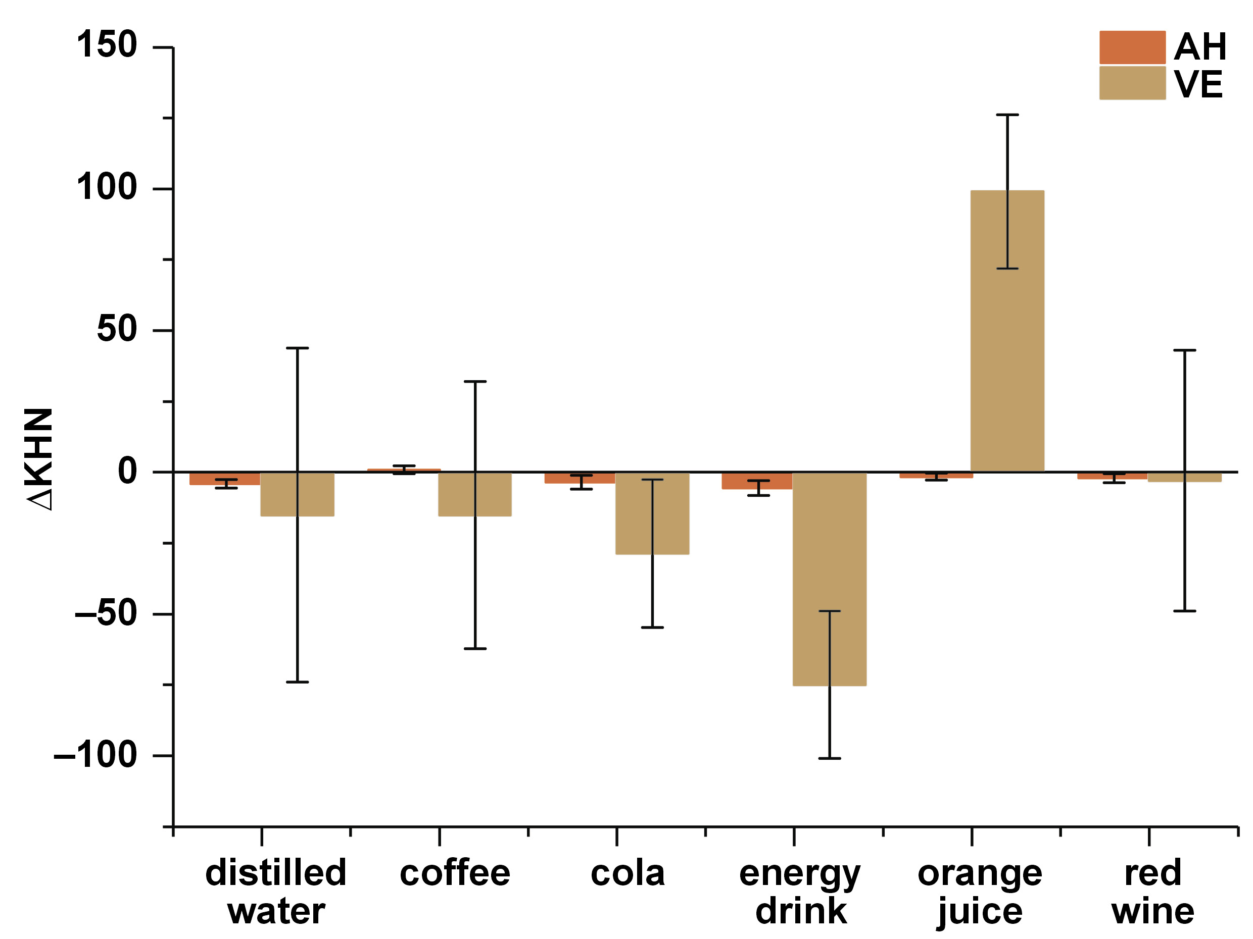 The ΔKHN results were different between AH and VE when the materials were immersed in the energy drink (p = 0.018) and orange juice (p = 0.001) (Figure 3). Regardless of the type of beverage in which AH was immersed, no significant difference was detected in ΔKHN. However, VE showed differences between the beverage groups (immersion in orange juice presented a greater microhardness change as compared to other beverages tested): distilled water vs. orange juice (p = 0.002); cola vs. orange juice (p < 0.001); coffee vs. orange juice (p = 0.002); the energy drink vs. orange juice (p < 0.001); and red wine vs. orange juice (p = 0.010).