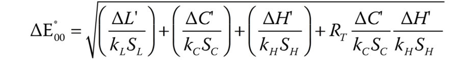 where ΔL’, ΔC’ and ΔH’ are the differences in luminosity, chroma and hue between the final and initial evaluation, and RT is the function that accounts for the interaction between chroma and hue in the blue spectrum. The SL, SC and SH values refer to the functional balance for luminosity, chroma and hue, and kL, kC and kH are parametric factors according to the visualization parameters, which are fixed at 1.26, 28