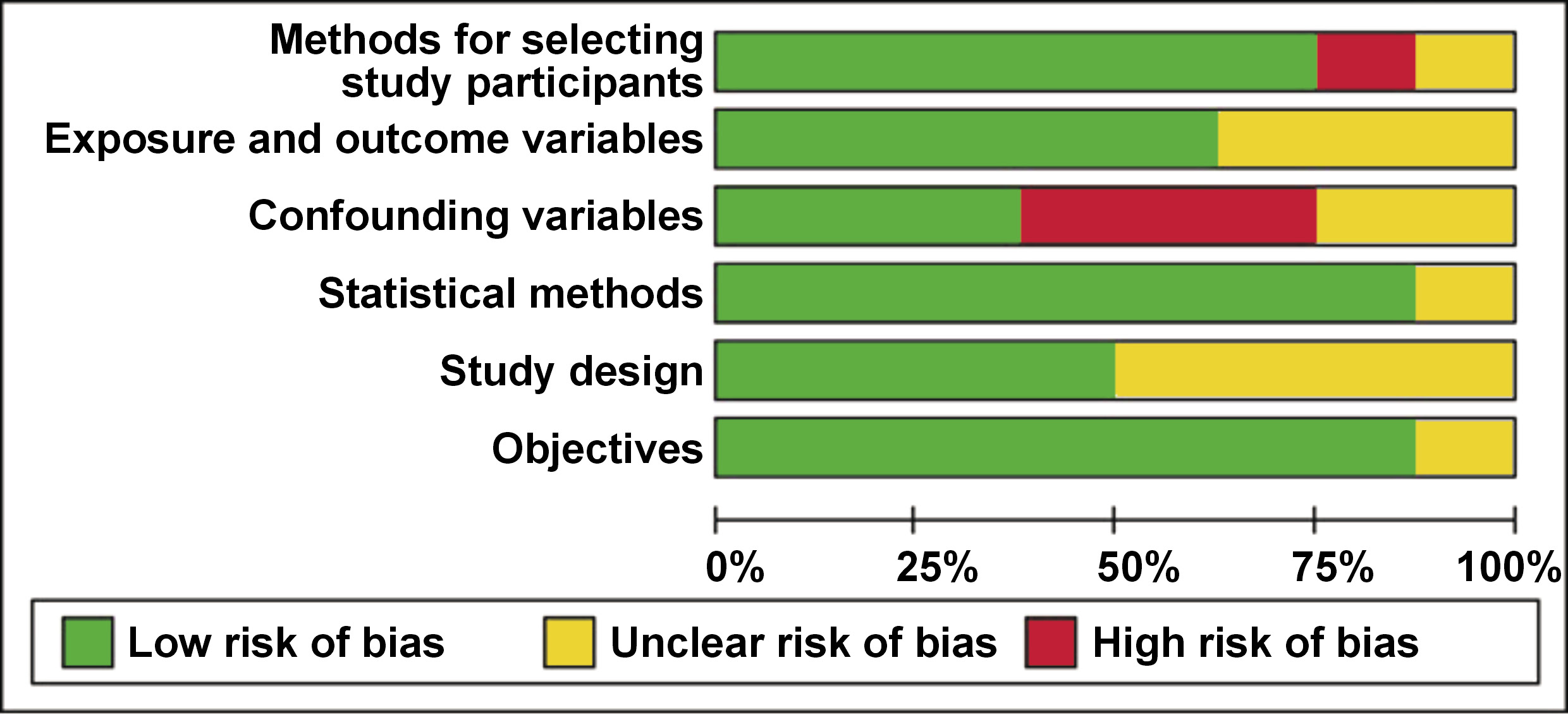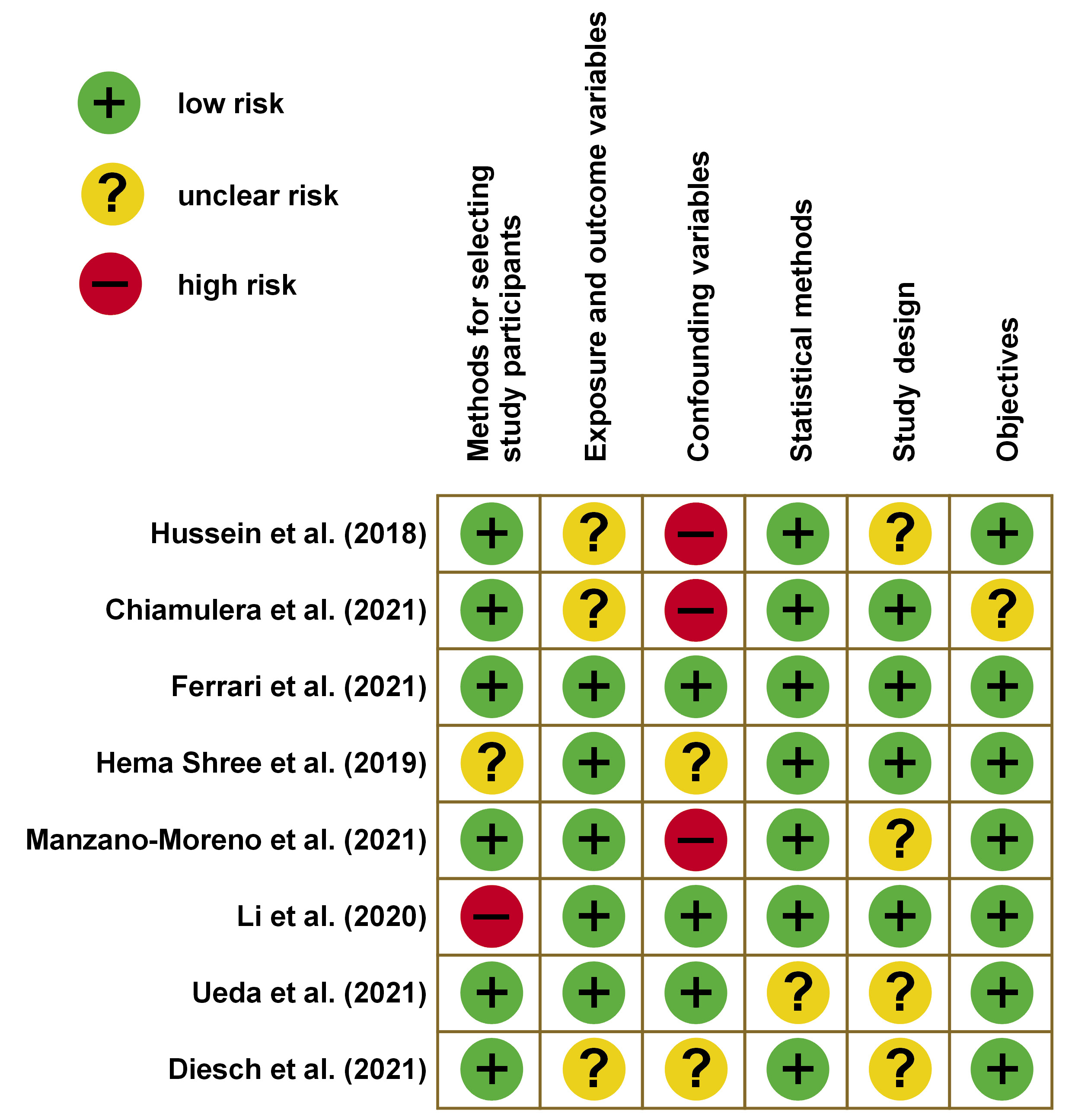A total of 67 articles published between 2019 and 2024 were identified through manual searches of PubMed®, Scopus, LILACS, Google Scholar, Embase, and Cochrane Library databases. The inclusion criteria for this review were studies published between 2019 and 2024, which utilized salivary cytokines as biomarkers. The case–control studies, longitudinal studies, clinical trials, and reviews were included. Human studies alone were considered for the inclusion, whereas in vitro studies and animal studies were excluded. Two individual reviewers independently evaluated the articles for risk assessment based on the STROBE (Strengthening the Reporting of Observational Studies in Epidemiology) criteria. The results are presented in Figure 1 and Figure 2. Following a thorough evaluation of the articles based on the predetermined inclusion criteria and risk assessment, 8 articles were selected for inclusion in this systematic review.