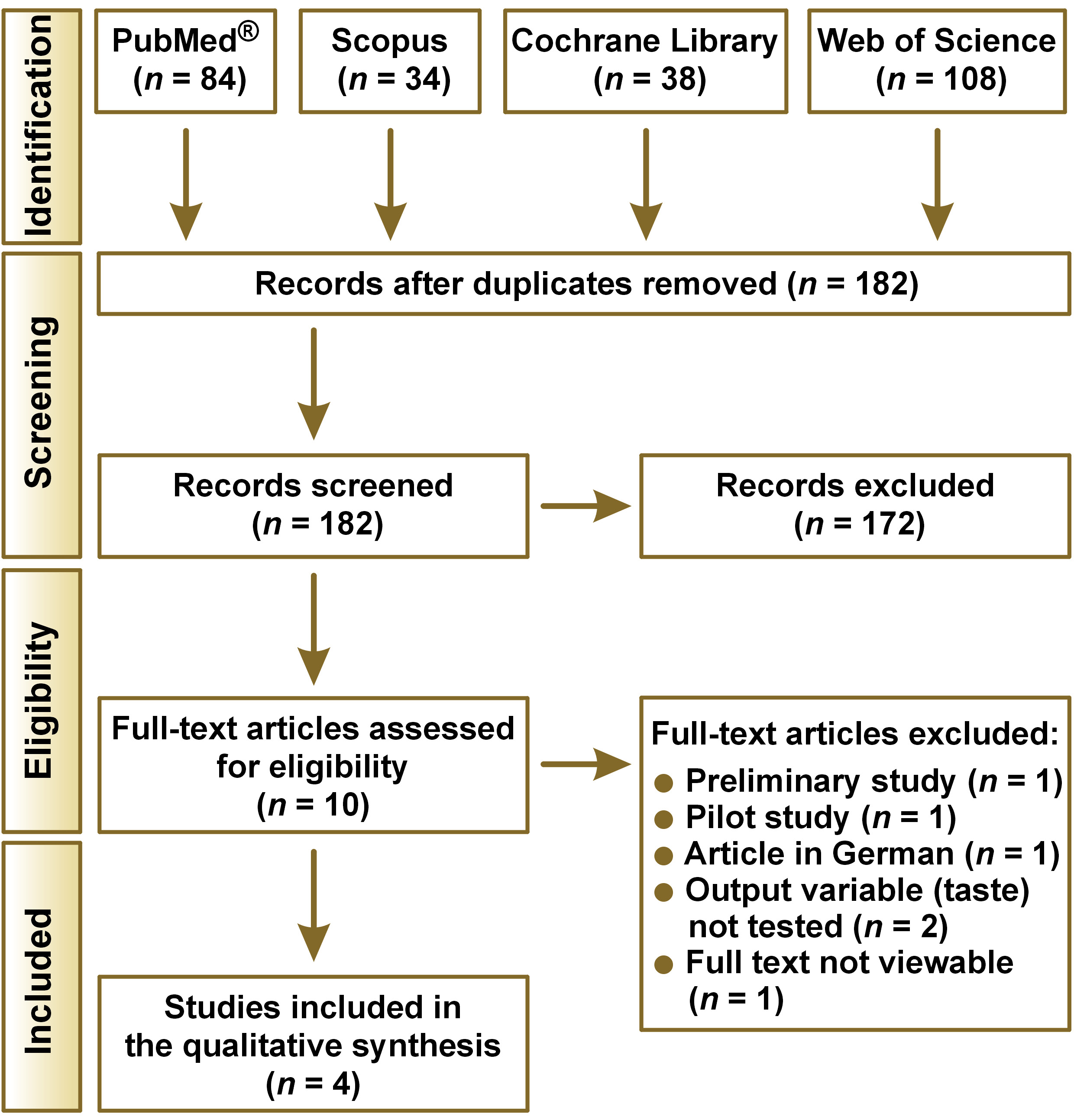 The analysis excluded single case studies, case series, pilot studies, preliminary studies, retrospective cohort studies, expert comments and opinions, editorials, studies that were not completed because they had been still under development, as well as articles not viewable as full texts and those with a sample of less than 10 subjects. Additionally, studies that evaluated patients with cognitive deficits or those who did not recognize at least 1 of the tested tastes were excluded to ensure the elimination of subjects with pathologies that involve an evident loss of taste or who take drugs that predominantly affect the perception of taste.