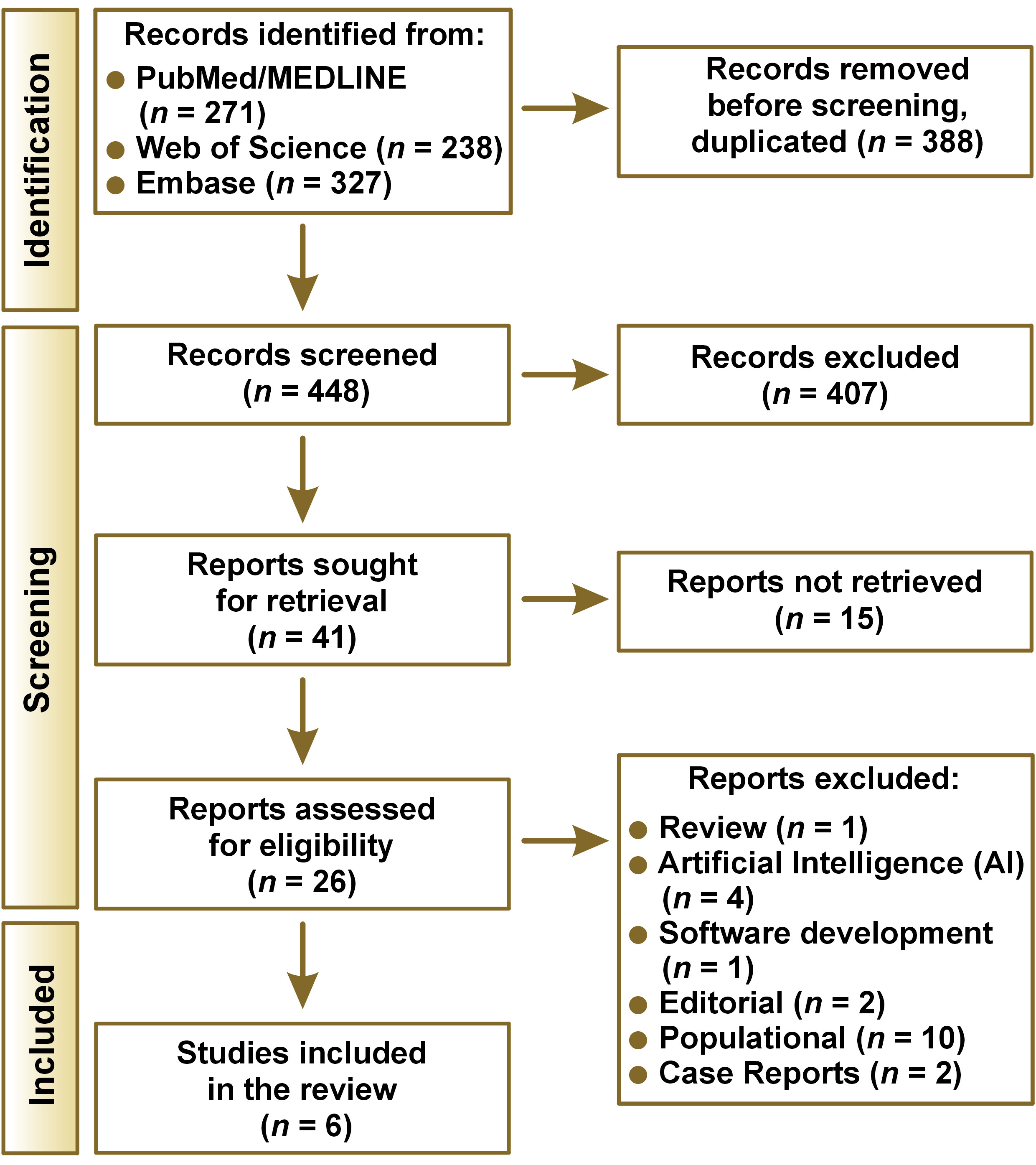 A total of 836 articles were initially found. Three hundred and eighty-eight duplicated articles were excluded. Only 26 articles followed for full-text reading. Then, 6 articles11, 13, 14, 15, 16, 17 were included in this critical review. The justification for the exclusions and all screening processes is summarized in Figure 1. There was a high agreement between the assessors (k = 0.98).