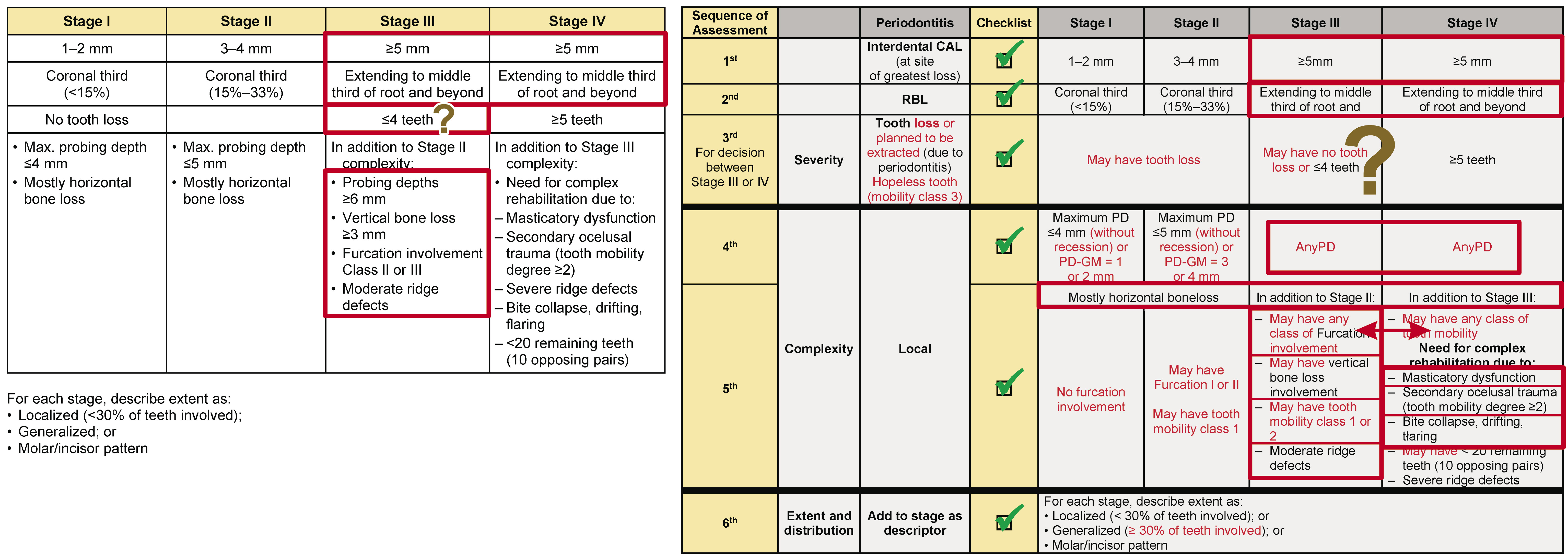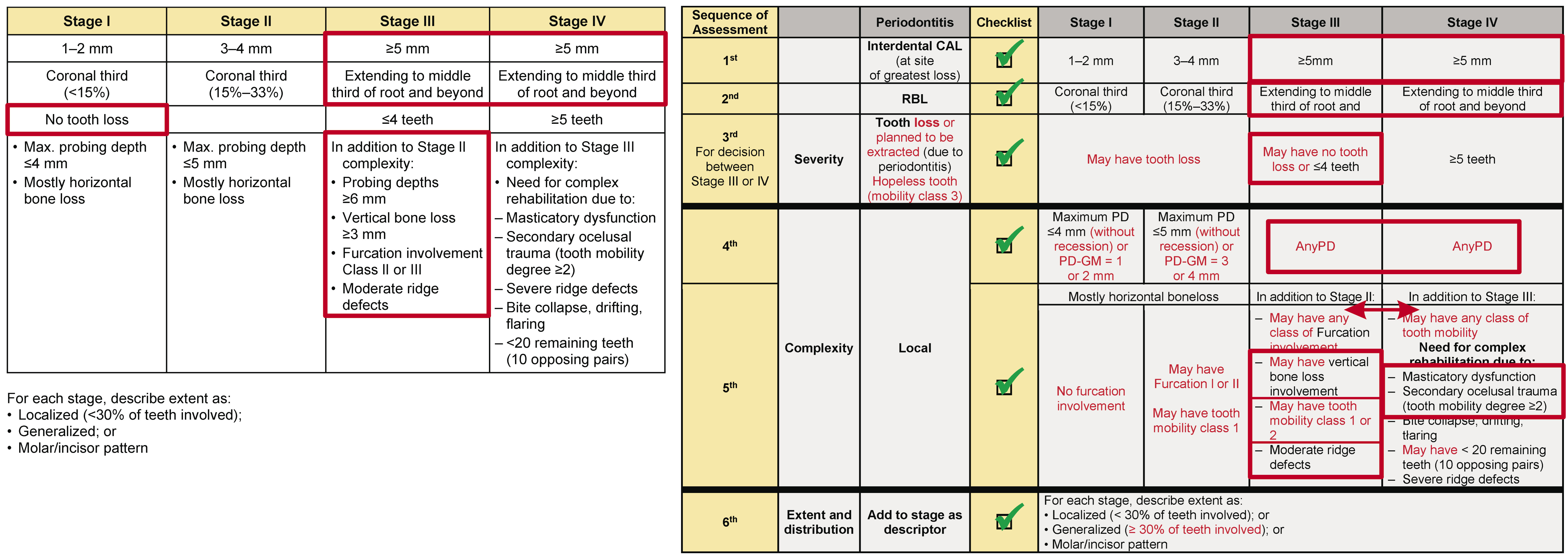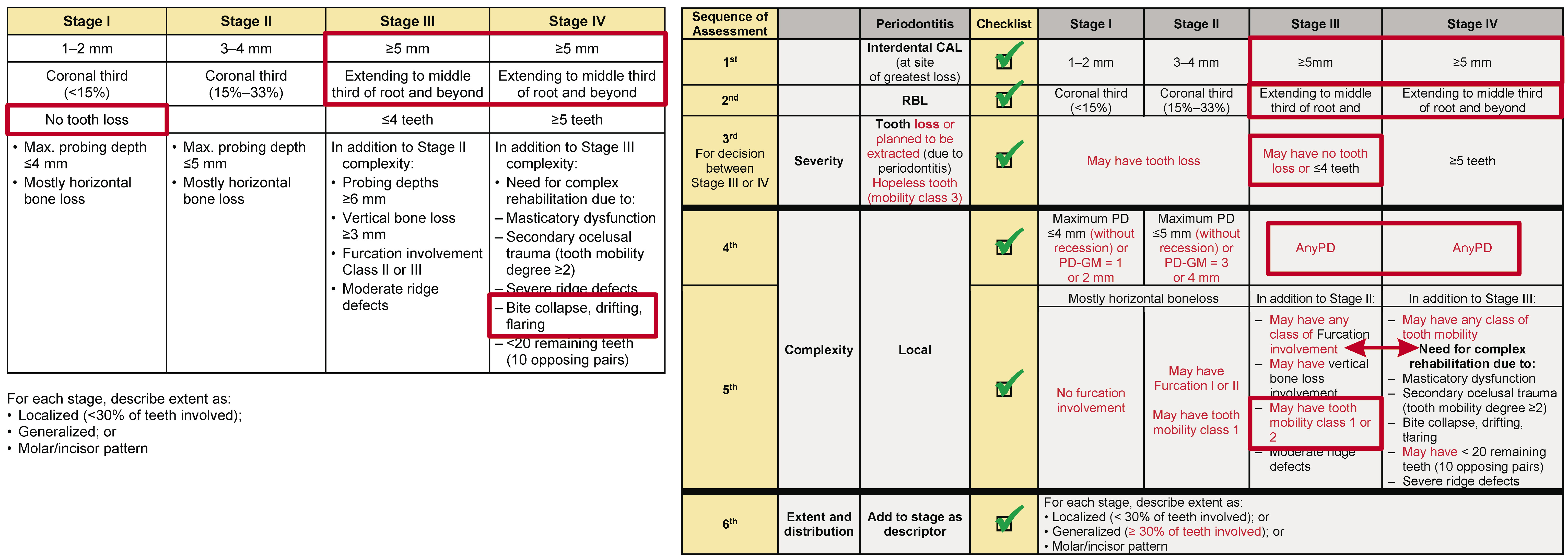 This review suggests the severity parameters cannot be overcome by the complexity parameters, following a cumulative sequence: clinical attachment loss (CAL) (1st); radiographic bone loss (RBL) (2nd); tooth loss due to periodontitis (TLP) (3rd); and then the complexity parameters. An exception must be permitted only for the complexity factors between Stages III and IV that can change the initial Stage (III or IV) obtained through the severity analysis, but only between the 2 stages. Moreover, for patients without tooth loss or with TLP ≤ 4 (without the need for complex rehabilitation), and presenting any type of drifting or flaring or a secondary traumatic occlusion, there is no justification for moving the diagnosis from Stage III to Stage IV.