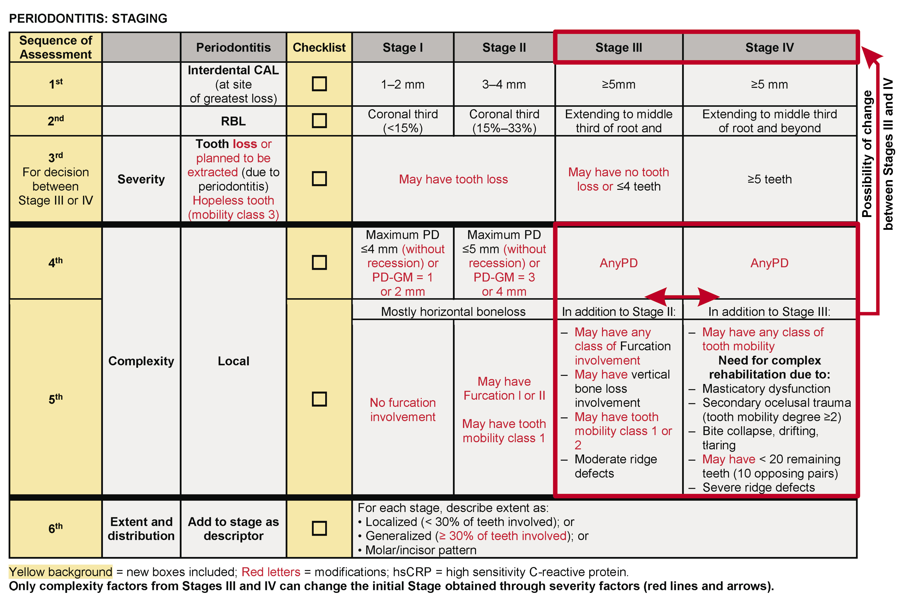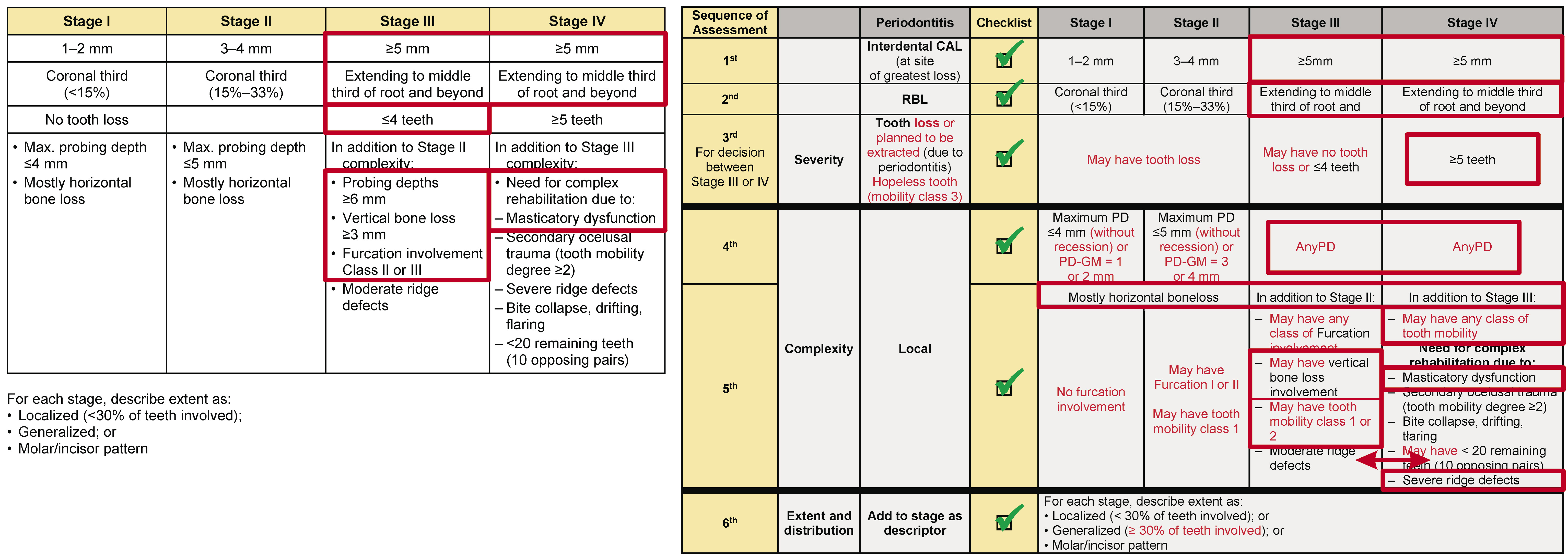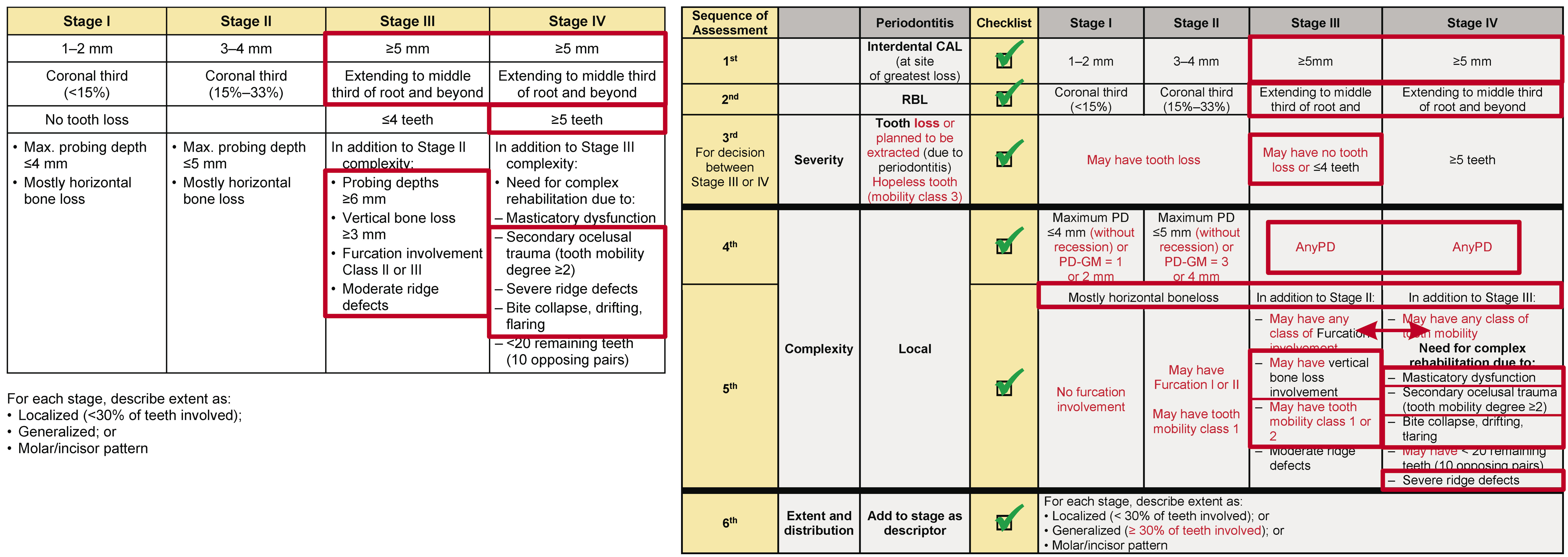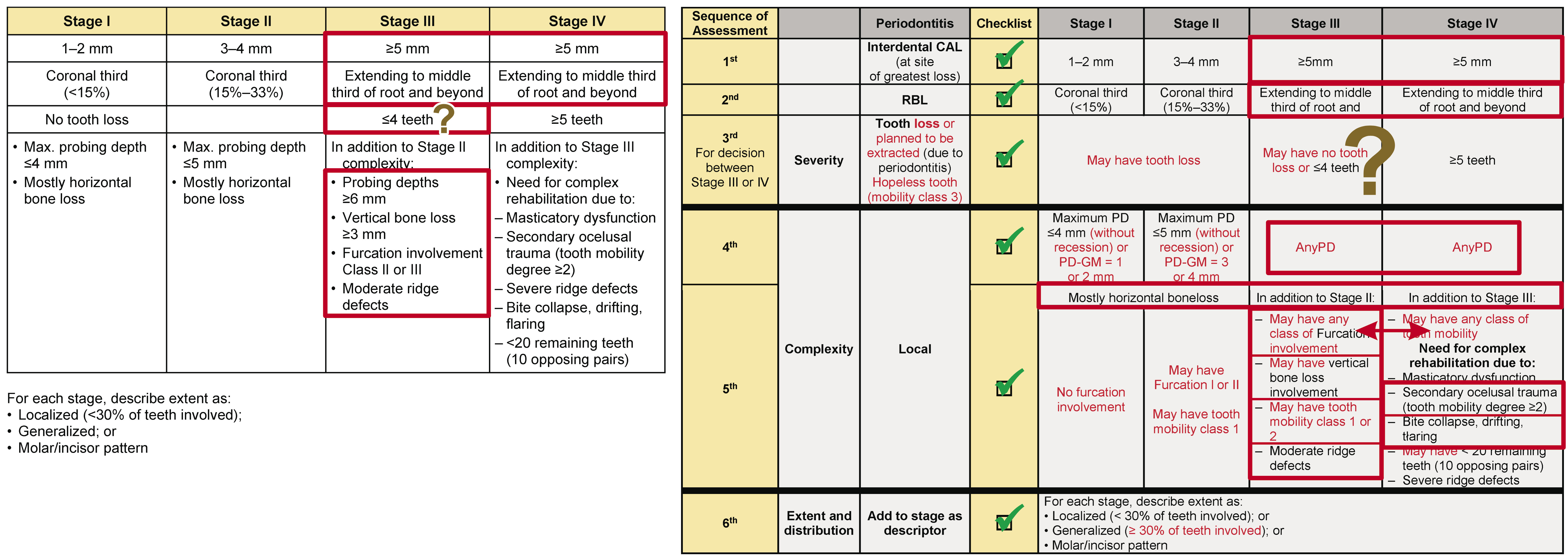 This review suggests the severity parameters cannot be overcome by the complexity parameters, following a cumulative sequence: clinical attachment loss (CAL) (1st); radiographic bone loss (RBL) (2nd); tooth loss due to periodontitis (TLP) (3rd); and then the complexity parameters. An exception must be permitted only for the complexity factors between Stages III and IV that can change the initial Stage (III or IV) obtained through the severity analysis, but only between the 2 stages. Moreover, for patients without tooth loss or with TLP ≤ 4 (without the need for complex rehabilitation), and presenting any type of drifting or flaring or a secondary traumatic occlusion, there is no justification for moving the diagnosis from Stage III to Stage IV.