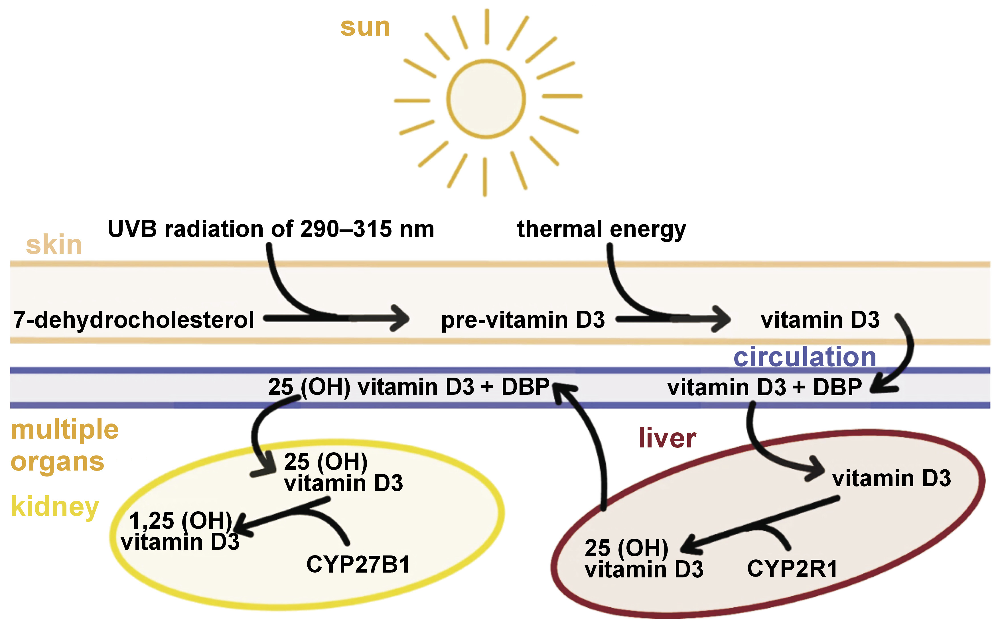 Under the influence of ultraviolet B (UVB) radiation at a wavelength of 290–315 nm (characteristic of sunlight) and in the presence of the appropriate reductase, the B-ring of 7-dehydrocholesterol opens, and a non-permanent compound – pre-vitamin D3 – is formed. This, in turn, isomerizes to cholecalciferol at skin temperature (about 25°C), which then enters the bloodstream.7, 8 In the liver, 25-hydroxylase influences the formation of 25-hydroxycholecalciferol (25(OH)D, known as calcidiol). The 2nd stage takes place in the kidneys, where 1α-hydroxylase catalyzes the conversion of the compound to its active form, 1α,25-dihydroxycholecalciferol (1α,25(OH)2D, called calcitriol) (Figure 1).7