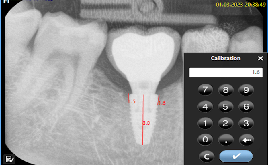 Bone loss was assessed using software designed for digital RVG analysis. Each evaluated image was calibrated against the implant length on the RVG and from medical records. The calculated value represented the arithmetic mean of the measurements taken on both sides of the implant, which were visible on the two-dimensional (2D) image. The calculations were made starting from the platform of the implant along its long axis (Figure 3 and Figure 4).