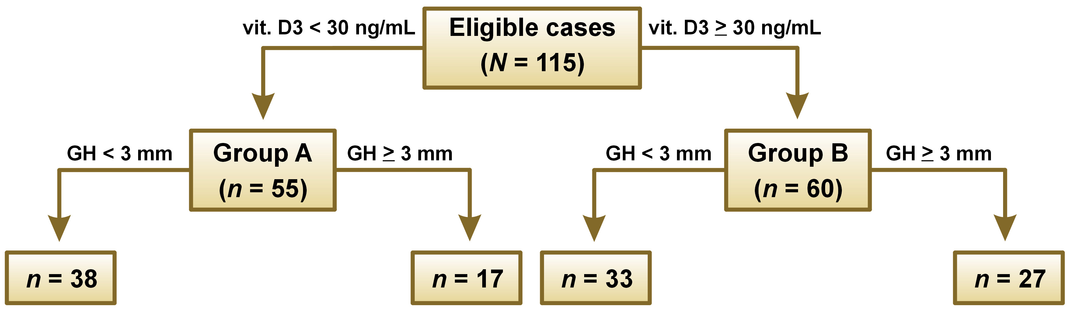 The cases (N = 115) were divided into 2 groups: group A (n = 55) were implants inserted with 25(OH)D levels below 30 ng/mL in blood serum, consisting of 17 cases with a gingival height of 3 mm or more and 38 cases with a gingival height of less than 3 mm; and group B (n = 60) were implants inserted with 25(OH)D levels equal to or above 30 ng/mL in blood serum, consisting of 27 cases with a gingival height of 3 mm or more and 33 cases with a gingival height of less than 3 mm (Figure 5).