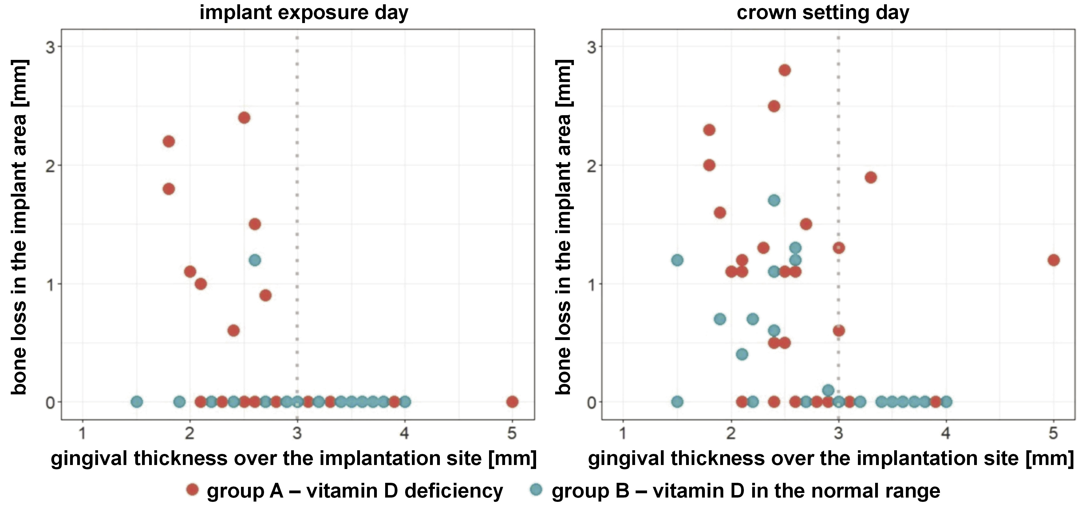 Results. Patients with vitamin D deficiency showed significantly higher levels of bone loss around implants as compared to those with normal vitamin D levels. Moreover, the thickness of the gingival tissue over the implant site had a significant effect on the preservation of the alveolar bone around the implant platform, regardless of the vitamin D3 status.