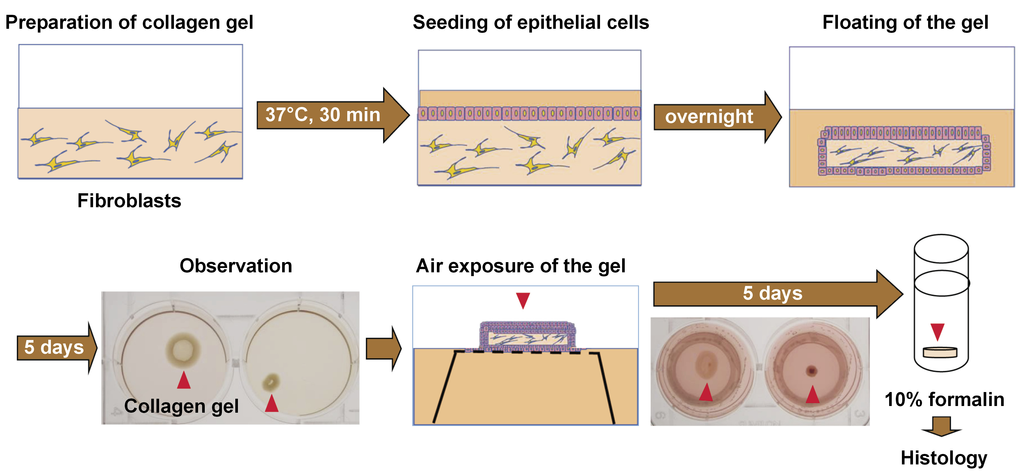 For histological analysis, some gels were cultured at the air-liquid interface to induce stratified epithelium.24 Cell inserts (Falcon® Cell Strainer; Corning, New York, USA) were adjusted and placed upside down in the wells. The floated gels were cultured on the turned-over inserts for an additional 5 days. After this period, the gels were fixed in 10% neutral buffered formalin solution and embedded in paraffin. Vertical sections were stained with hematoxylin and eosin (H&E) and examined under an optical microscope (ECLIPSE Ni-L; Nikon Corp., Tokyo, Japan) (Figure 1).