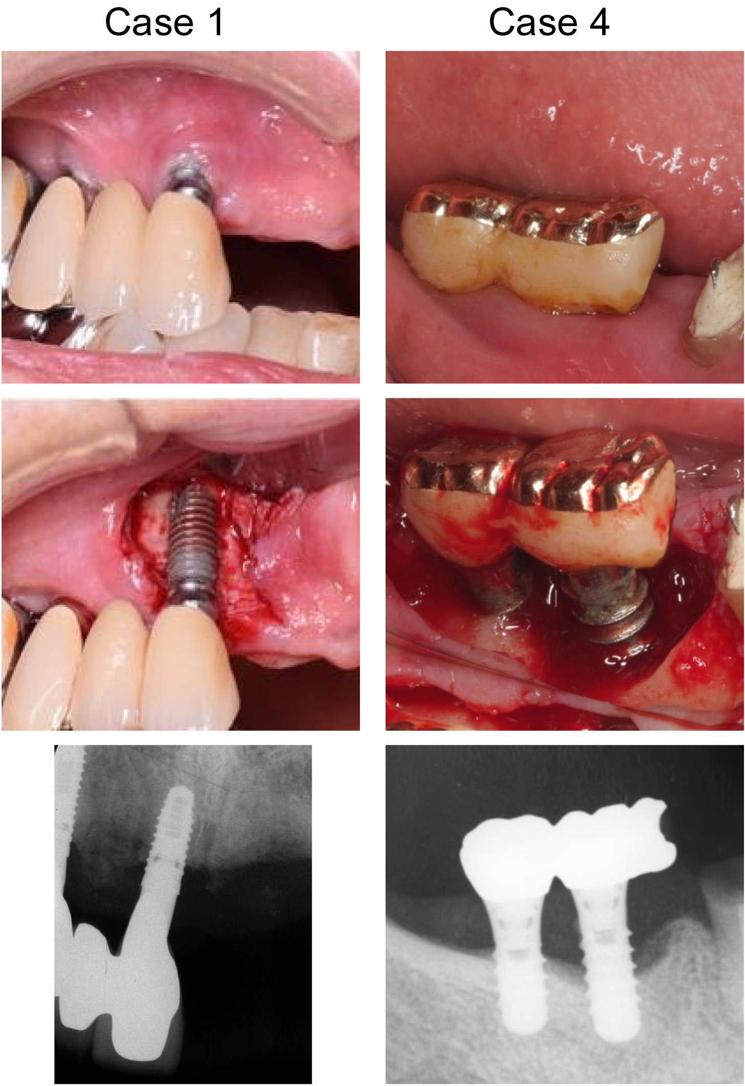 The demographic information of the participants and the characteristics/locations of the treated implants are presented in Table 1. The levels of peri-implantitis for those implants ranged from moderate to severe (4.2–8.7 mm of bone defect depth) in terms of bone resorption, with 6–10 mm of probing pocket depth (PPD), and BOP observed at all sites. Figure 2 presents the clinical photographs and radiographs of 2 cases (case 1 and case 4).