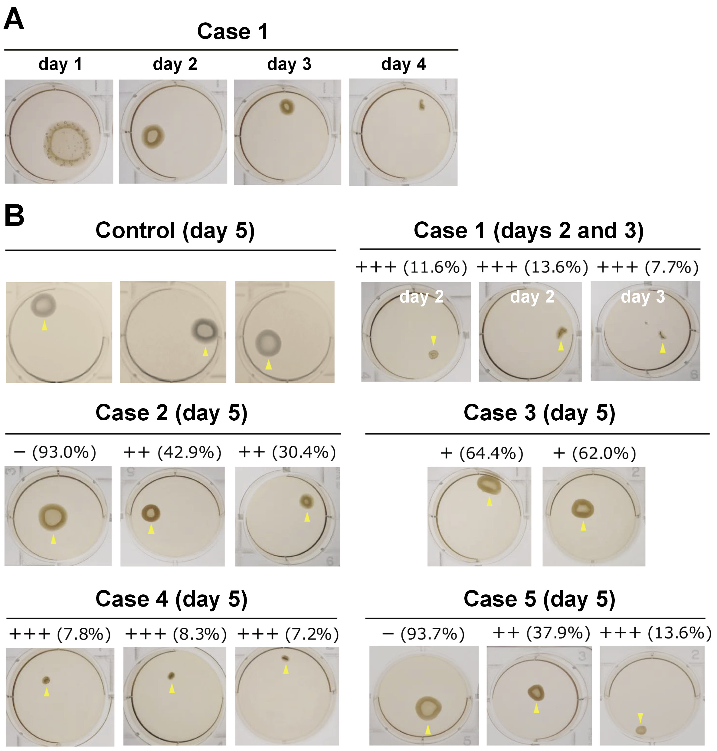 Fibroblast growth was observed to be optimal in 4 cases and poor in 1 case. The 5 cases showed gel contraction to varying extents (Table 2, Figure 3), which may indicate the presence of PIAFs that display the capacity for collagen degradation. Severe (+++) gel contraction was detected in 3 cases (1, 4, 5) for which good cell growth was observed. In 2 of those cases (1 and 4), a significant number of populations showed severe (+++) gel contractions, with case 1 being associated with the most severe gel contractions. Interestingly, the gel contraction observed in case 1 was notably aggressive, with the fastest contraction speed noted in this study, surpassing the rates recorded in our prior investigations employing PAFs. Consequently, the gel evaluation for case 1 was conducted earlier, on days 2–4.
