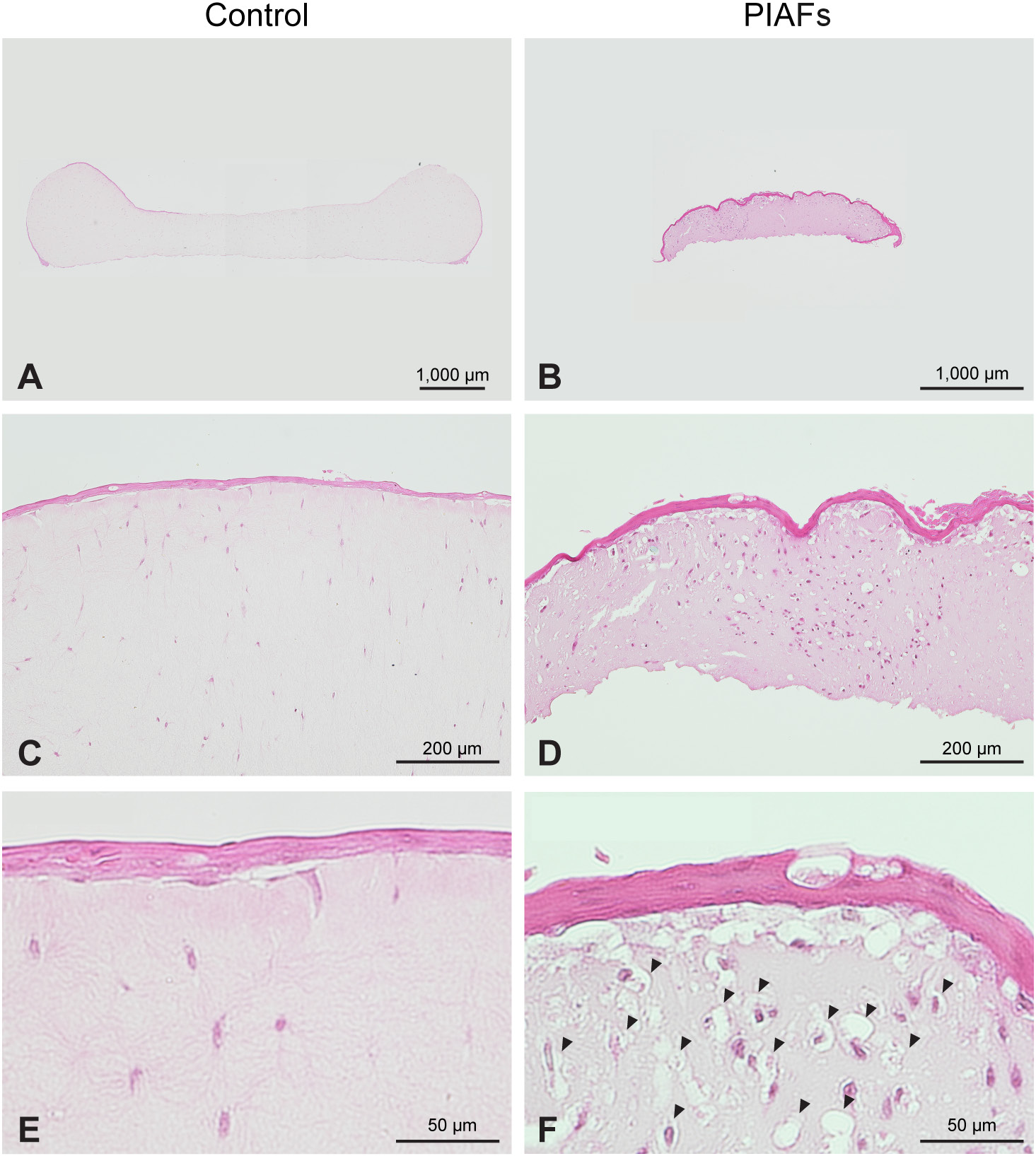 Figure 4 shows representative photomicrographs of gels with normal fibroblasts (Figure 4A,C,E) and PIAFs (case 4) (Figure 4B,D,F). The collagen gels with normal fibroblasts showed plain and weak staining with few cells (Figure 4C,E), while the gels with PIAFs demonstrated a significant contraction with a substantial cellular presence. This contraction can be attributed to the shrinkage of the gel and the presence of numerous vacuoles adjacent to the cells (Figure 4D,F), possibly occurring due to the degradation of the collagen matrix. The cell nuclei were considerably different, with spindle-shaped nuclei characteristic of normal fibroblasts and round-shaped nuclei predominating in PIAFs.
