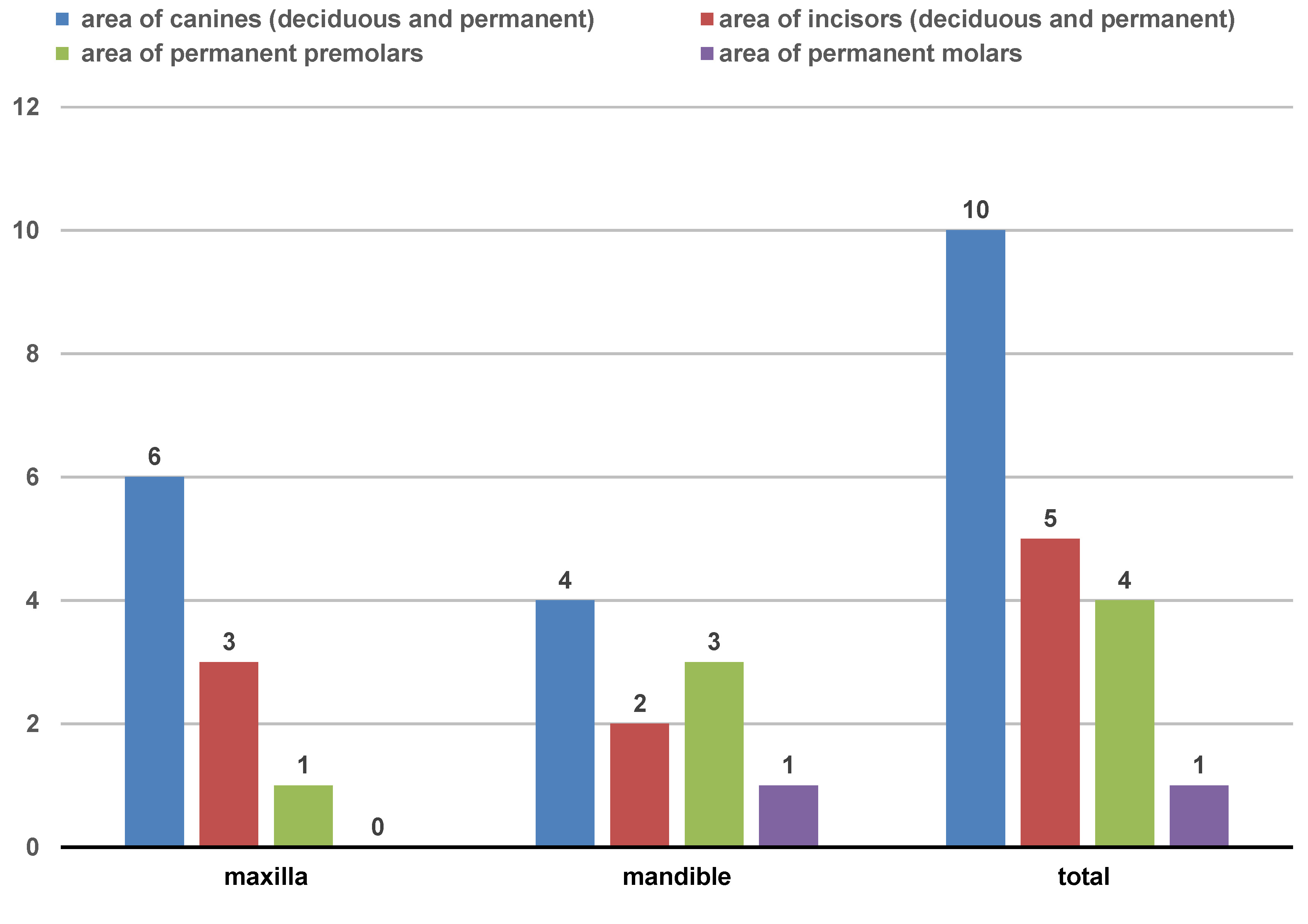 All patients were referred for diagnostic examination by dentists: 11 (55%) of them due to missing teeth; 3 (15%) due to retained deciduous teeth; 9 (45%) had limited distension of the alveolar process of the maxilla or the alveolar part of the mandible; 2 (10%) had gaps between their teeth; 1 (5%) experienced pain; 2 (10%) had exophytic lesions; in 3 patients (15%), the lesion was discovered incidentally in plain radiography. Some patients had 2 or more symptoms simultaneously, for example, gaps between the teeth and the distension of the alveolar process of the maxilla or the alveolar part of the mandible (1 (5%)) or an impacted tooth and the distension of the alveolar process of the maxilla or the alveolar part of the mandible (2 (10%)). Most patients reported no pain. Only one boy at the age of 3.6 years reported moderate pain of a distending and continuous nature. In 2 boys (aged 2.8 and 3.6 years), changes in facial features in the form of cheek protrusion were observed. The buccal skin in the area of the lesions was unaffected, without signs of inflammation. None of the participants had palpable or painful submandibular lymph nodes. The most common intraoral symptoms included the absence of a deciduous or permanent tooth typical for the patient’s age despite the presence of a corresponding tooth on the other side, and alveolar process enlargement (protrusion, a gap between the teeth). Five of the 9 patients with alveolar enlargement also lacked a tooth typical for their age, of which 1 child was from the group with deciduous teeth (1/5) and 4 children were from the group with mixed/permanent dentition (4/5). Nine patients were lacking a single tooth, the remaining 2 (each of them) were lacking 2 teeth (teeth 71 and 81, 43 and 44). The most commonly missing teeth were deciduous or permanent canines. Radiological examination showed that all the missing teeth were impacted. In 3 patients from the group with mixed/permanent dentition, the absence of a tooth was accompanied by the presence of retained deciduous tooth/teeth (teeth 61, 73, 84, and 85). Lesions were more frequently observed in the maxilla (55%), predominantly in the area of canines (50%) and incisors (25%), and they were least frequent in the lateral segment (25%) (Table 1, Figure 1).