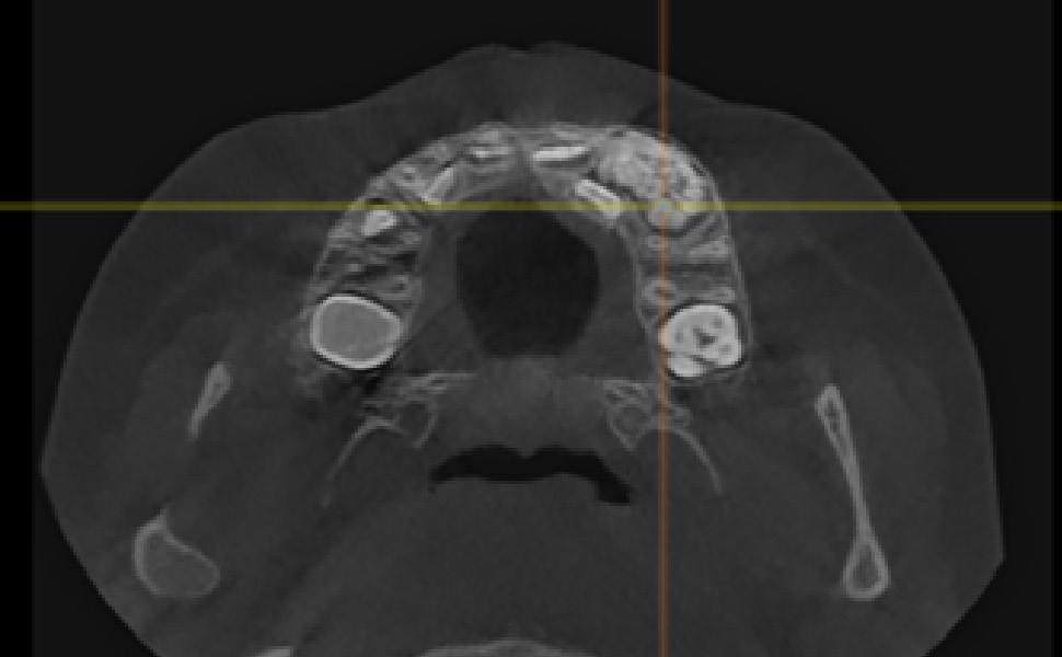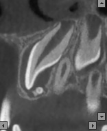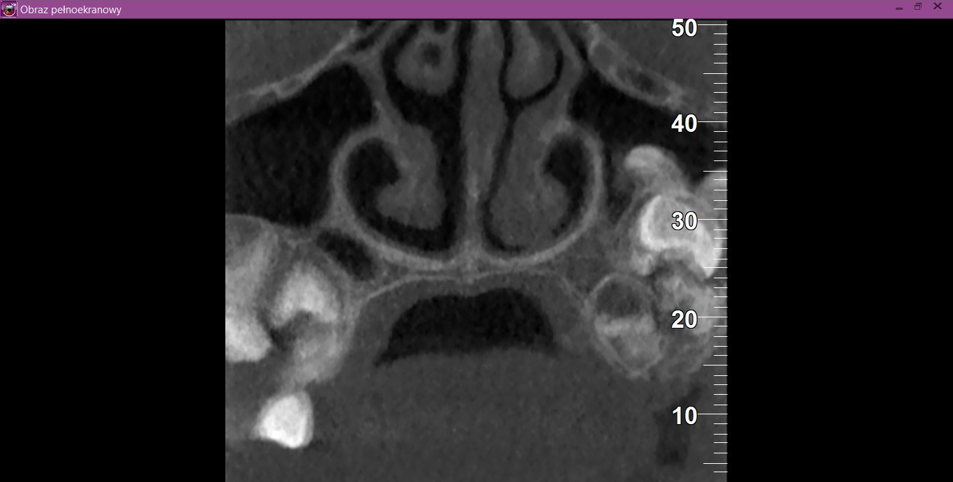 Recently, there has been improvement in X-ray diagnostic imaging methods, especially with regard to CBCT, which certainly facilitates arriving at diagnosis as early as at the stage of radiological examination. Jayam et al. describe a case of an 11-year-old girl with a radiological picture (panoramic radiography, a tooth X-ray and a maxillary occlusal radiograph) description of impacted tooth 11 with an additional cusp and an extensive dentigerous cyst.2 In the course of marsupialization, the dentigerous cyst was found to have no contact with tooth 11, while it contacted the adjacent additional cusp. On histopathological examination, OCp was diagnosed with a cyst. According to some authors, X-ray images – panoramic radiographs and targeted dental X-rays – may not accurately reveal the pattern of the lesion, which is why cross-sectional CBCT is recommended in the case of doubts or for more accurately determining the location.2 In the case of 2 of our patients, it was not until a CBCT was performed that the adequate diagnosis was reached, and it was later confirmed during the procedure and histopathological examination. The first patient was a 9-year-old girl referred to an orthodontist in our clinic due to impacted tooth 21 for the exposure of the tooth and the application of a bracket to the crown of tooth 21. The patient had with her a current panoramic radiograph with visible impacted tooth 21, showing a small non-distinctive radiopacity in the tooth crown, which could be consistent with an additional cusp. An X-ray of tooth 21 was performed at our clinic, revealing a non-distinctive area of radiopacity next to the crown of tooth 21 (Figure 7). The patient was referred for cross-sectional CBCT. After verification, OCp was diagnosed and removed with its capsule, and an orthodontic bracket was attached to tooth 21 in local anesthesia (Figure 8). Histopathological examination confirmed the preliminary diagnosis of OCp. The other patient was a 5-year-old girl who was admitted to our clinic with a missing deciduous tooth 65. The patient had a current panoramic radiograph with her, revealing an impacted tooth (most probably tooth 65) with a non-distinctive area of radiopacity (Figure 9). Cross-sectional CBCT was recommended. In the X-ray image, the preliminary diagnosis suggested OCp with the impacted deciduous tooth 65 above it and the tooth bud of permanent tooth 25 on the palatal side (Figure 10). The procedure involved the resection of the impacted deciduous tooth 65 and the enucleation of the odontoma with its capsule; the tooth bud of tooth 25 was left. Due to the child’s age and her poor cooperation, the procedure was carried out in general anesthesia. Histopathological findings revealed OCp.