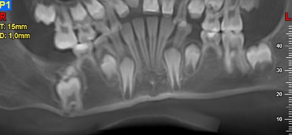 The treatment of choice for odontomas is a surgery involving the complete enucleation of the tumor with its capsule. According to de Oliveira et al.4 and Qazi et al.,23 if an odontoma causes the impaction of the tooth bud of a permanent tooth, the tumor should be removed as soon as possible, before the root of the permanent tooth is fully developed (e.g., before it reaches half of its length) to prevent its permanent impaction. According to Uma, in turn, if after the removal of an odontoma, the impacted tooth does not erupt within 3 months of the procedure, the patient should be referred to an orthodontist.3 In conclusion, odontomas should be removed as soon as possible to prevent the occurrence of complications in the form of dental abnormalities. In our clinic, the tumors were removed as soon as possible (within a month from the first appointment). In one case, the procedure was postponed in a 4-year-old boy (with antiphospholipid syndrome) who was receiving chemotherapy. On clinical examination, the protrusion of the alveolar process of the maxilla and a small gap between deciduous teeth 62 and 63 were observed, and there were no impacted teeth. The procedure was performed 4 months after the first appointment, during which OCp was diagnosed.