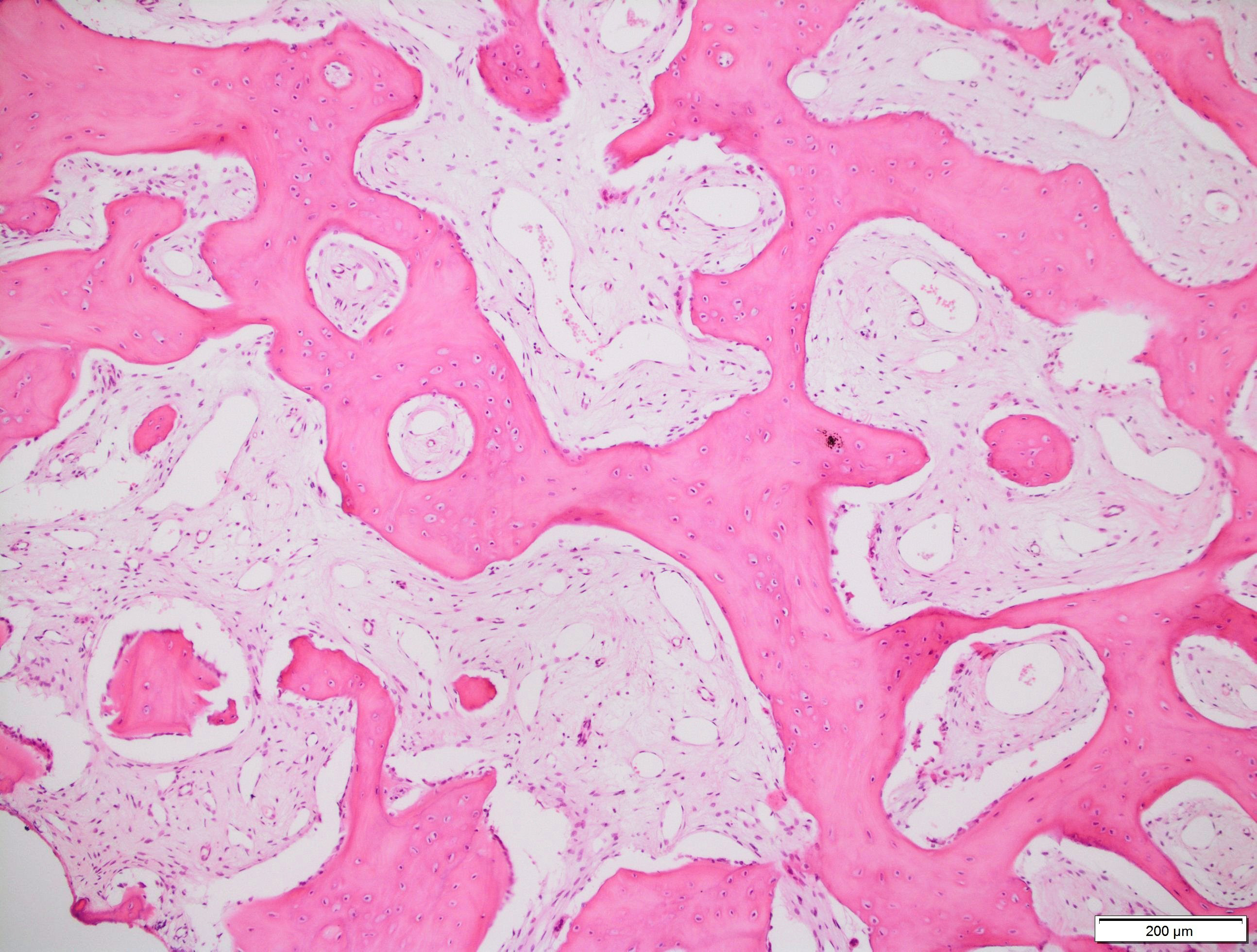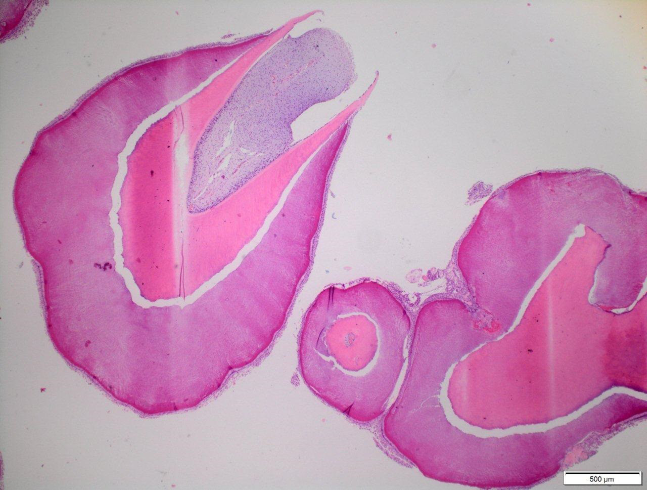 In the case of all patients, it was decided that their tumors and the capsules surrounding the tumors would be enucleated surgically in local or general anesthesia (depending on the patient’s age and cooperation). After the procedure, the patients received antibiotics – amoxicillin, or alternatively clindamycin in the case of an allergy to penicillins – at doses adjusted to the body weight (b.w.) and age of the child in mg/kg b.w./day, or at doses as for adults (more than 40 kg). The material was sent for histopathological examination. On microscopic examination, in 16 cases (80%), the lesions were described as OCp, 2 (10%) as OC, and 2 (10%) as erupted odontomas (visible in the oral cavity). Compound odontomas were described as fragments of the dental pulp, dentin, enamel matrix, epithelium with fragments of connective tissue, or fragments of a tooth with preserved histological structure, with fibrovascular tissue without epithelial covering and with foci of chronic inflammatory granulation tissue (Figure 4). Complex odontomas, on the other hand, were described as fragments of dentin and connective bone tissue (Figure 5).