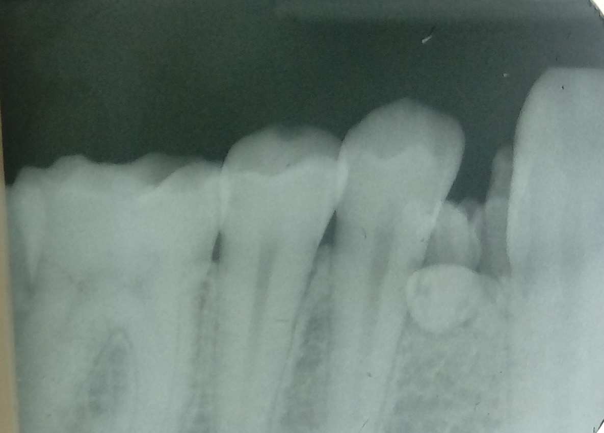 Amailuk and Grubor claim that traumas are among the causes of odontomas.5 The authors described a case of a 15-year-old boy from Sudan with OCp that was erupted, together with malformed crown and root of the upper left central incisor 21. It was decided that the odontoma and tooth 21 would be removed, and the crown of the upper right central incisor 11 reconstructed (tooth 11 had erupted with a malformed crown). The authors report that the odontoma and abnormalities in teeth 11 and 21 were caused by a childhood trauma. In some African countries, in accordance with local beliefs, children aged from 3 months to 3 years have the buds of their deciduous teeth removed by their healer for protection against viruses and vomiting. The authors mention 2 more cases of children who had their deciduous tooth buds removed in a ritual in their childhood, and then were diagnosed with an odontoma in their adolescence.5 In one of our patients (17 years old, with nephritic syndrome), the odontoma was visible in the oral cavity in the region of lower left canine 33 and lower left first premolar 34. During the first appointment, the visible nodule was diagnosed as an erupting supernumerary tooth, and it was not until an X-ray was performed that the correct diagnosis of OCp was reached, which, due to its occurrence in the oral cavity, was described as an erupted odontoma (Figure 6). In this case, similarly to our other patients, the patient’s parents could not remember past traumas or inflammations in the region of the odontoma.