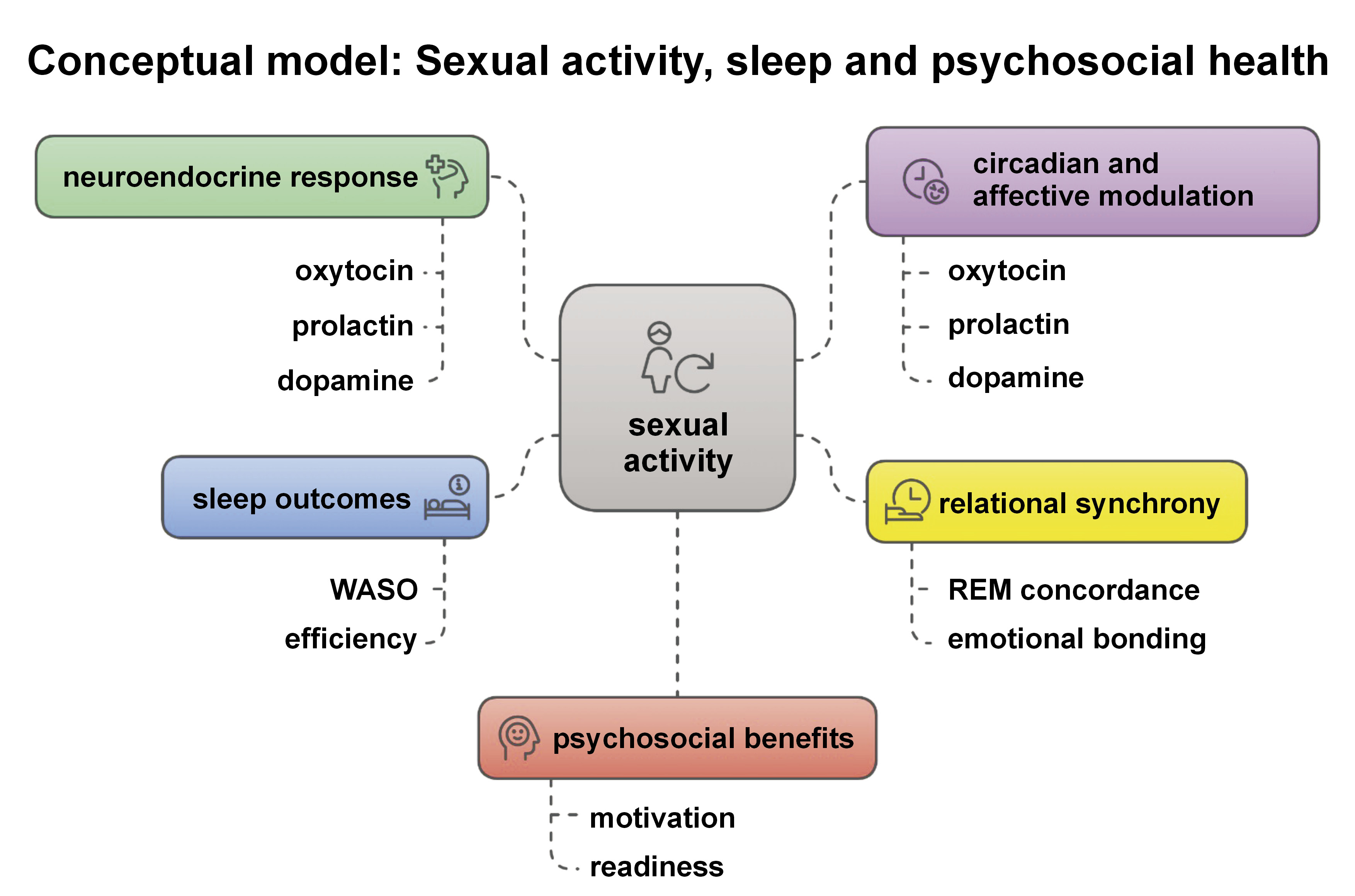 Importantly, the possible role of these behavioral pathways extends beyond sleep outcomes. The exploration of sexual activity (whether partnered or solitary) as a coping mechanism for psychosocial stress,4 anxiety, depressive symptoms, and obsessive-compulsive tendencies5 opens a line of investigation that is both clinically relevant and ethically delicate. While pharmacological interventions remain essential for many, they are not without side effects, including REM sleep suppression, cognitive impairment and the risk of dependency. In contrast, sexually intimate behavior, when voluntary and contextually appropriate, may provide a socially reinforcing alternative with fewer adverse consequences. Yet, such behavioral suggestions must be personalized and consensual, with attention to the risk of coercion or the disruption of spontaneity within relationships.