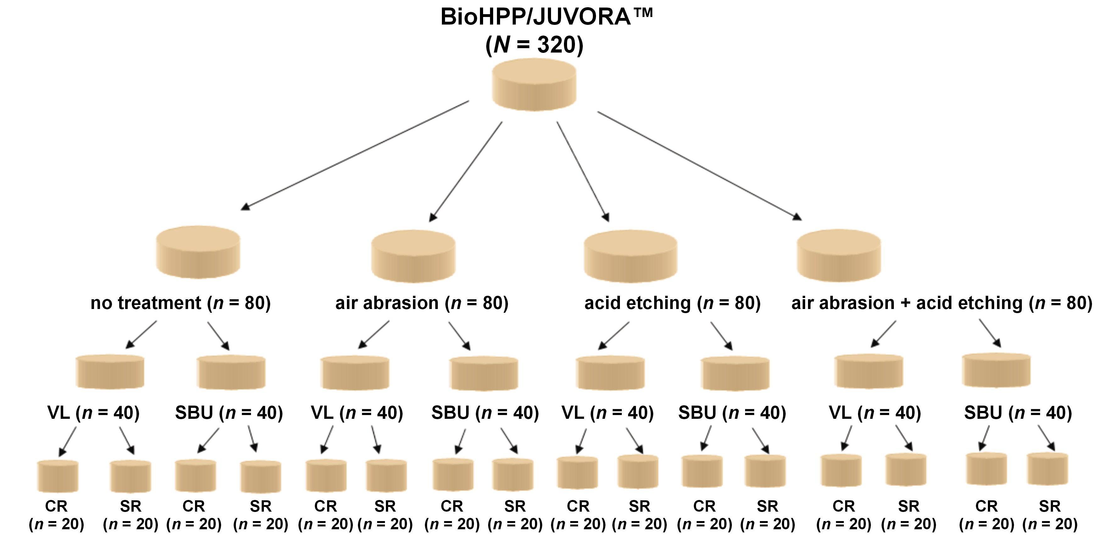 Material and methods. A total of 328 PEEK specimens (JUVORA™ (unfilled PEEK material, n = 164); BioHPP (compound containing 20% nanoceramic-filled PEEK, n = 164)) were divided into 4 groups according to the applied surface treatment: no treatment; air abrasion; acid etching; and acid etching + air abrasion. Subsequently, all specimens were conditioned with visio.link (VL) or Single Bond Universal (SBU). The specimens were veneered with crea.lign composite (CR) or SR Nexco composite (SR), and the bond strength values were measured. The co-variance analysis of variance (ANOVA) was performed to analyze the data (α = 0.003).