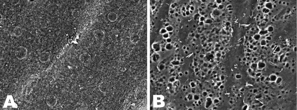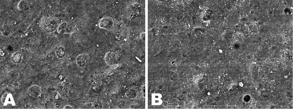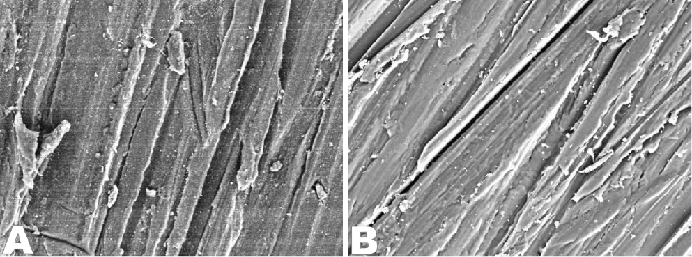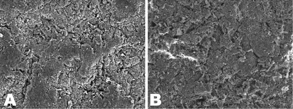 Following surface treatments, the SEM images of BioHPP and JUVORA™ were obtained (Figure 2, Figure 3, Figure 4, Figure 5). Irregular structures formed by abrasive papers were observed on the surfaces of the specimens even in the absence of surface treatment (Figure 2A,B). In the BioHPP specimens, the piranha acid-etched surfaces exhibited low porosity (Figure 3A), while the JUVORA™ specimens demonstrated a honeycomb pattern (Figure 3B). The regular structure underwent deterioration after air abrasion treatment, resulting in a formation of a recessed and protruding surface (Figure 4A,B). After air abrasion and piranha acid etching, the surfaces exhibited recessed and protruded features, in addition to the presence of porous areas (Figure 5A,B).