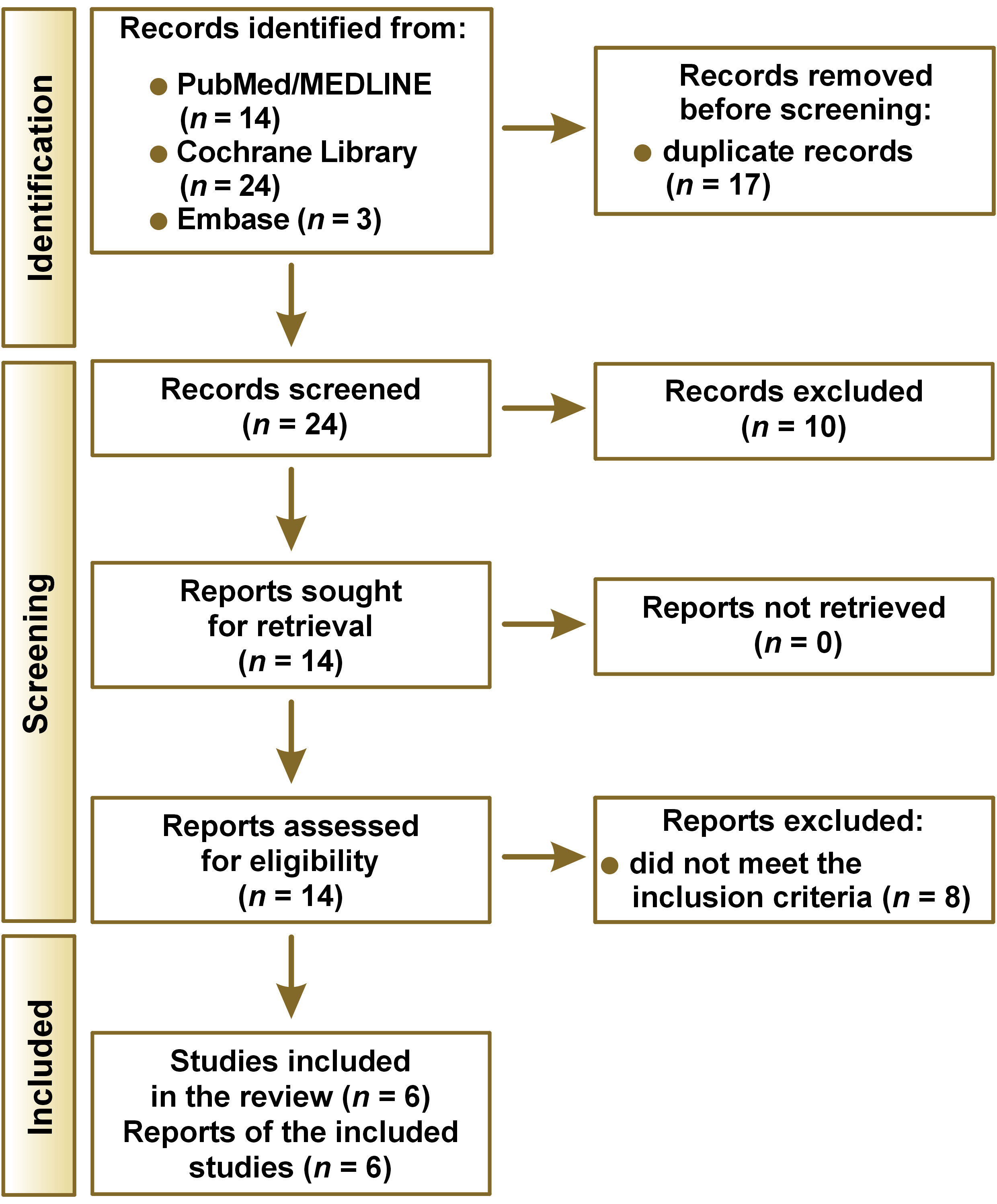 As a result of the systematic literature review, 41 articles were identified: 14 from PubMed/MEDLINE; 24 from Cochrane Library; and 3 from Embase. After removing the duplicates (n = 17), a preliminary screening of titles and abstracts was performed. Ten articles were excluded because they did not meet the eligibility criteria. After revising the full texts of the remaining 14 articles, 8 studies were excluded because they did not meet the inclusion criteria for this systematic review. A total of 6 studies met the inclusion criteria and were selected for analysis and data extraction in accordance with the PRISMA recommendations. A flowchart of the study is presented in Figure 1.