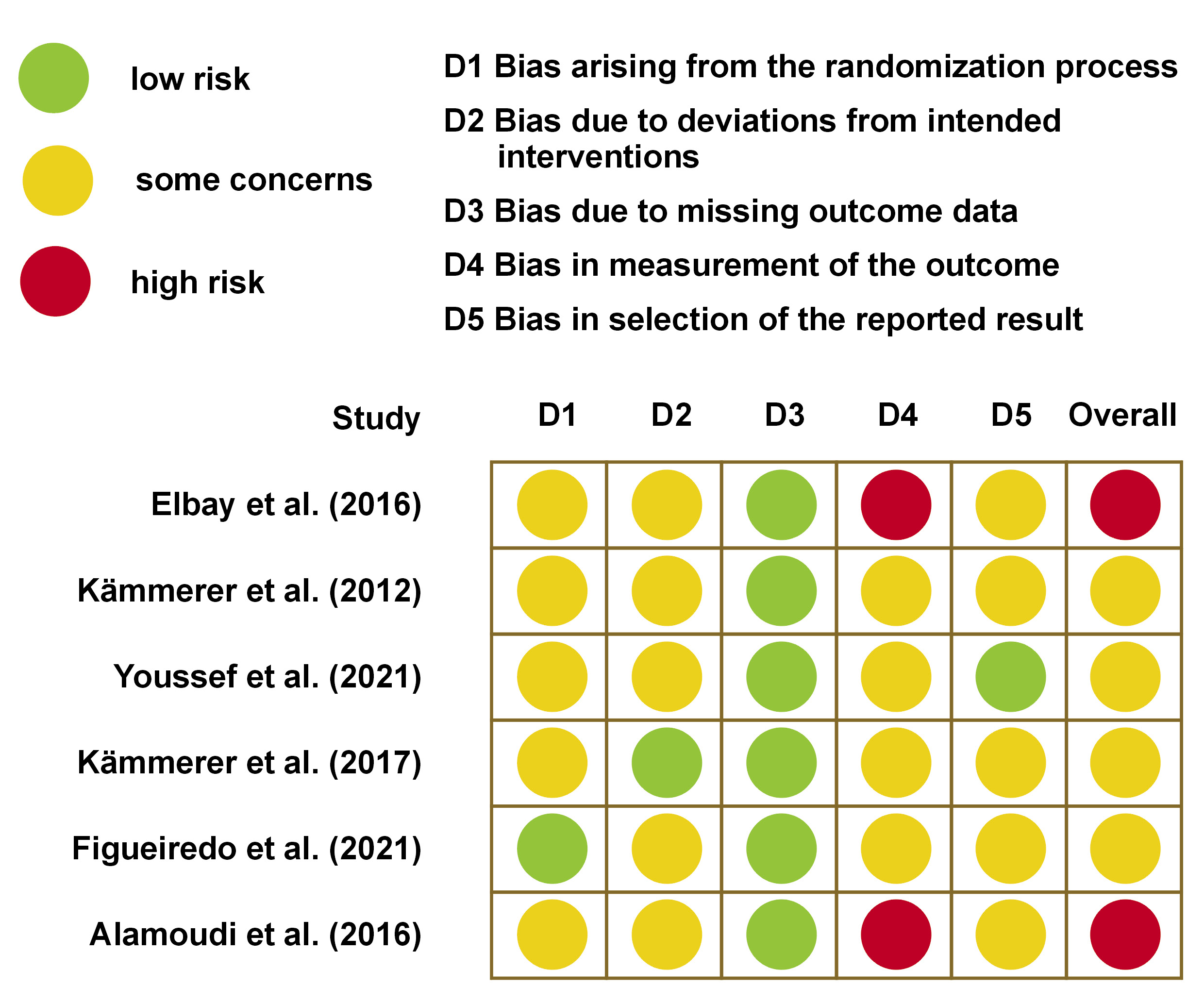 In study 5, the randomization of allocation is described in detail, thereby ensuring that the study is free from allocation bias. The sample size of the study, as well as the age and sex of the participants are given. The anesthetic solution was composed of 4% articaine and 1:100,000 epinephrine. The study in question was a double-blind clinical trial. Informed consent was obtained from all eligible participants; however, it was not mentioned whether participants and caregivers were blinded or not. The individuals who delivered the intervention were blinded. Therefore, the bias caused by deviations from intended interventions has given rise to some concerns. The outcomes of all randomized participants were documented, and the bias resulting from missing outcome data was low. The study does not provide any information regarding the measurement of outcomes. The individual responsible for assessing the outcomes was blinded. The study did not address the methodology employed to assess complications, which suggests potential concerns regarding the bias in the measurement of the outcome. Similarly, concerns have been raised regarding the selection of the reported results. Thus, the overall risk of bias in the study is indicative of some concerns.