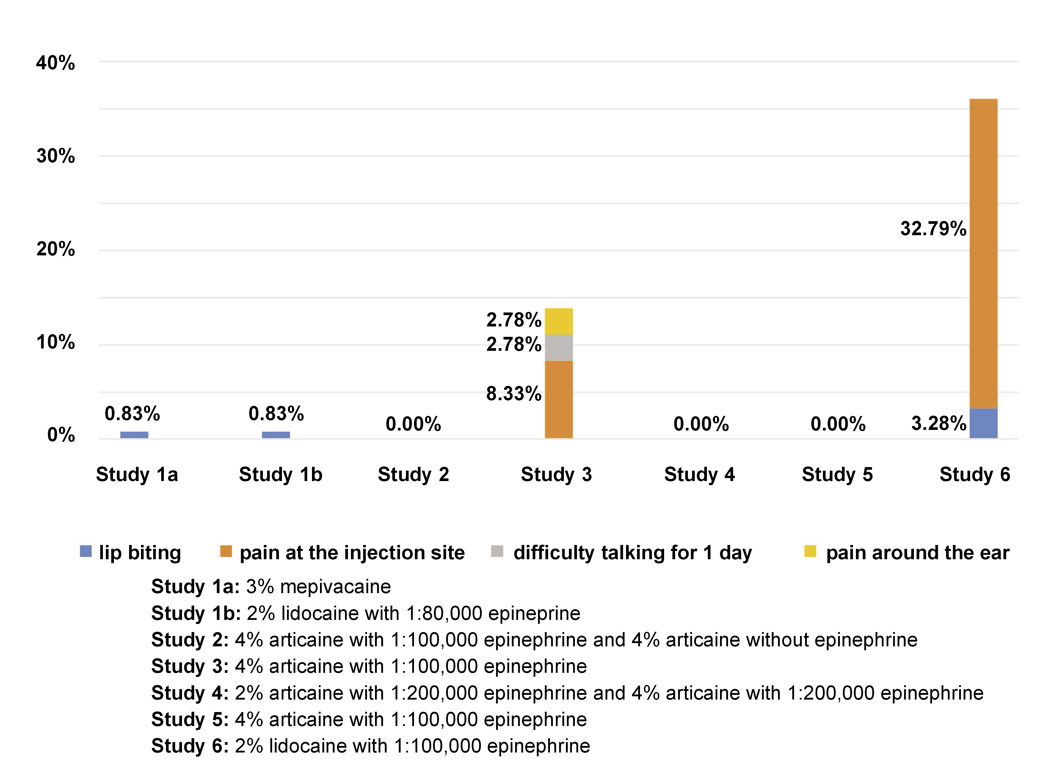 A total of 524 patients (151 children and 373 adults) were evaluated and 7 different anesthetic solutions were included in this systematic review (2% lidocaine with 1:80,000 epinephrine, 2% lidocaine with 1:100,000 epinephrine, 3% mepivacaine, 4% plain articaine, 4% articaine with 1:100,000 epinephrine, 4% articaine with 1:200,000 epinephrine, and 2% articaine with 1:200,000 epinephrine).