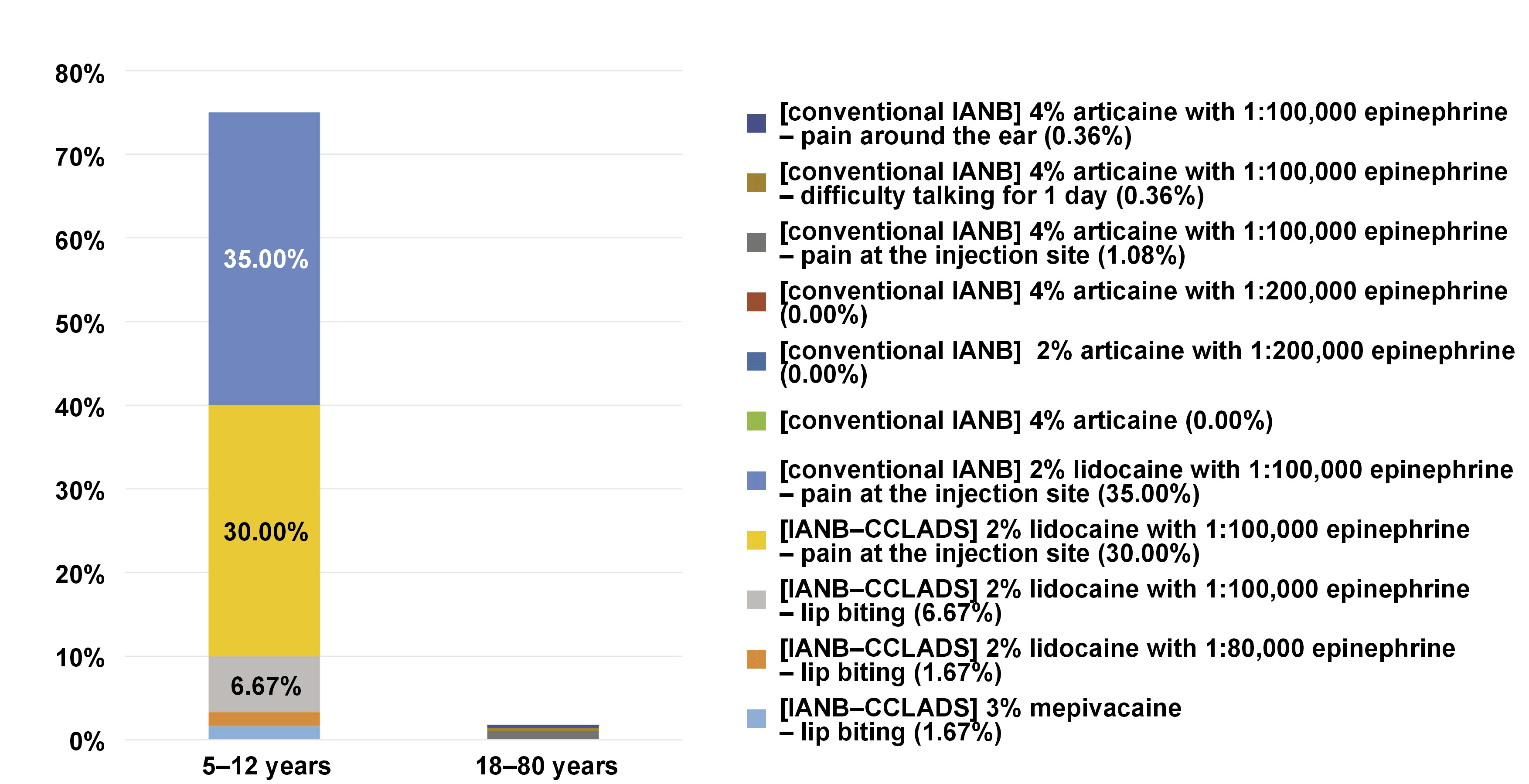 Thus, the objective of the present study was to extract and analyze available data on the IANB technique combined with different local anesthetics (2% lidocaine with 1:80,000 epinephrine, 2% lidocaine with 1:100,000 epinephrine, 3% plain mepivacaine, 4% plain articaine, 4% articaine with 1:100,000 epinephrine, 4% articaine with 1:200,000 epinephrine, and 2% articaine with 1:200,000 epinephrine) in pediatric and adult patients. The study aimed to provide valid evidence for comparing results concerning possible complications.