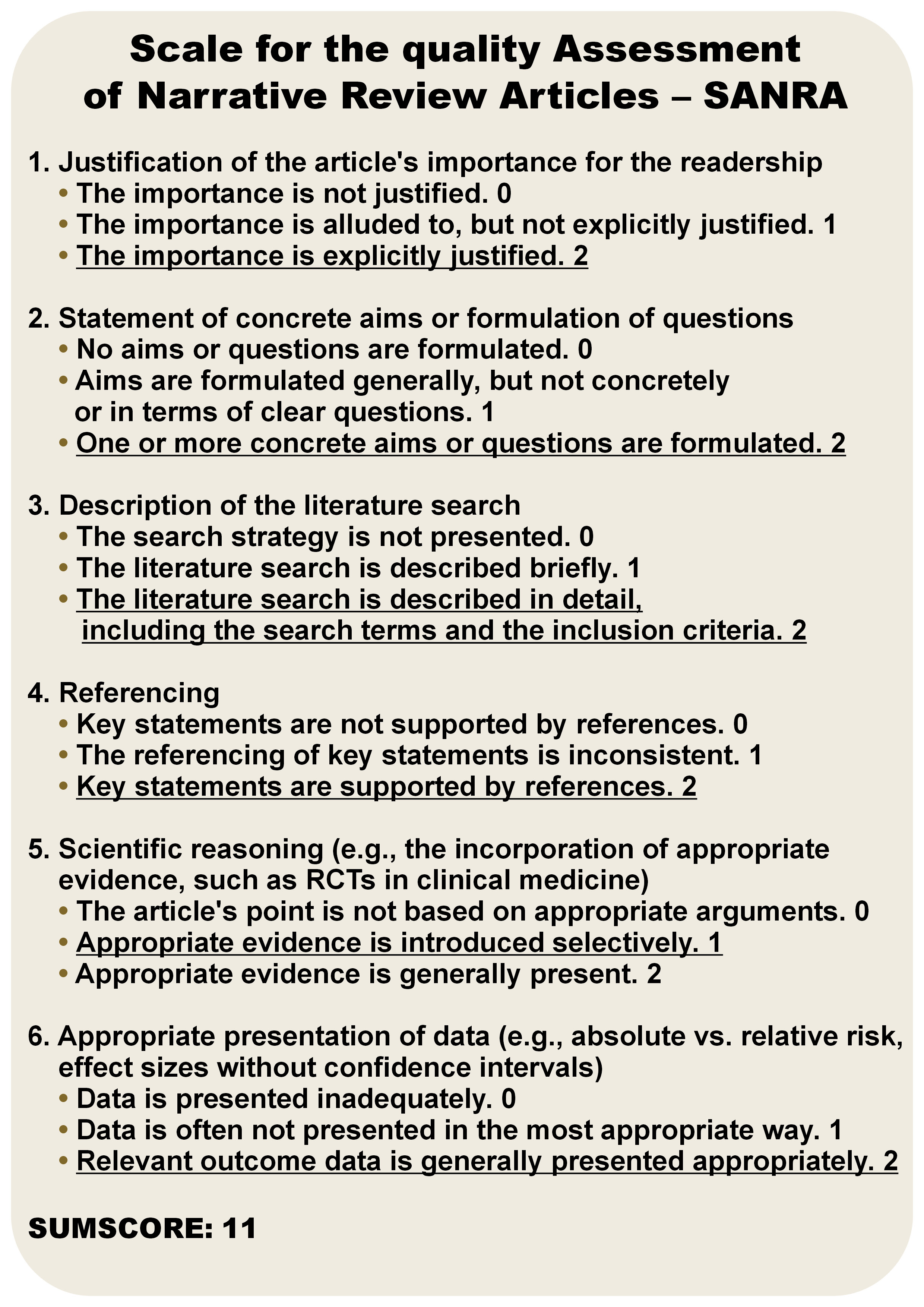 The literature search was performed in the Embase and PubMed databases, using the combinations of the following keywords: (“cancer*” OR “malignancy*” OR “tumor*” AND “Crohn’s disease” OR “ulcerative colitis” OR “inflammatory bowel disease*” OR “IBD”). The search was limited to the articles published between January 2015 and August 2024. The asterisks allowed us to retrieve records where the query words appeared with suffixes. The exclusion criteria were as follows: experimental studies (including animal studies and in vitro research); non-IBD studies; studies solely on CRC; non-original articles; non-English language; abstracts; and posters. The evidence-based medicine (EBM) pyramid was used to assess the quality of the studies.12 This narrative review followed the Scale for the quality Assessment of Narrative Review Articles (SANRA) criteria and the SANRA score for the review is presented in Figure 1.13